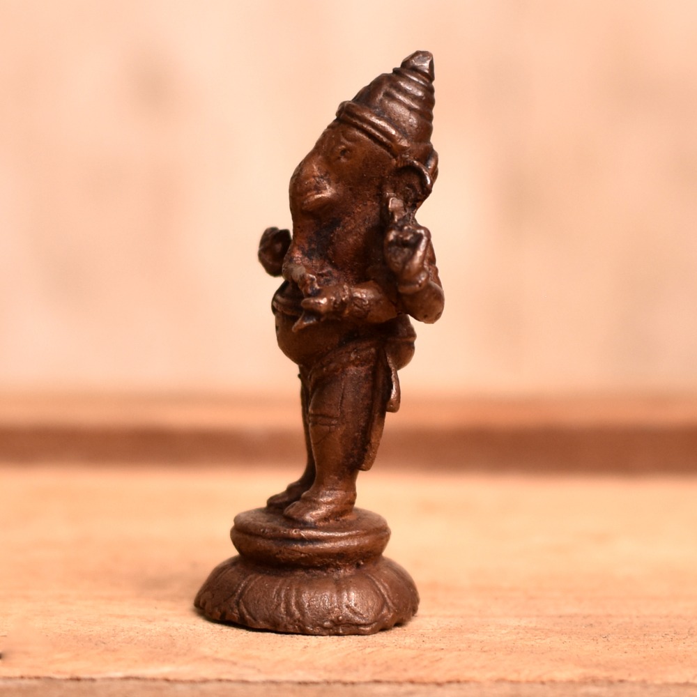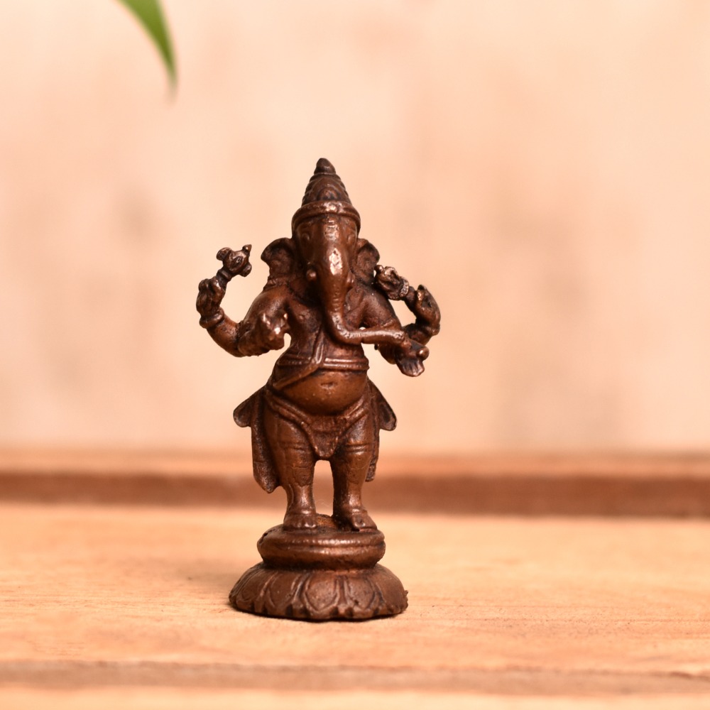 Elevate your spiritual practice with this exquisite copper statue of Lord Ganesha in a standing position, meticulously handcrafted by highly skilled Indian artisans. Lord Ganesha, the Hindu god of wisdom and prosperity, is intricately portrayed in this stunning idol, capturing his divine attributes with exceptional attention to detail. Made with high-quality copper, which is considered an auspicious metal in Hindu culture, this Lord Ganesha statue is not only a sacred symbol for worship but also a remarkable piece of art that exudes elegance and grace. Its standing position adds a dynamic and majestic presence to any space, making it a perfect addition to your home, office, or temple prayer room. This Lord Ganesha idol is a thoughtful gift for your loved ones on special, festive, or auspicious occasions, symbolizing blessings of wisdom, success, and prosperity. Embrace the spiritual significance of Lord Ganesha with this beautifully crafted copper statue, a cherished addition to your home or a meaningful gift for your dear ones. Buy this Copper Lord Ganesha Statue online and invite the divine presence of Lord Ganesha into your life.