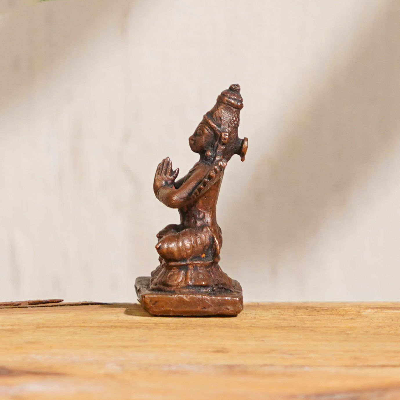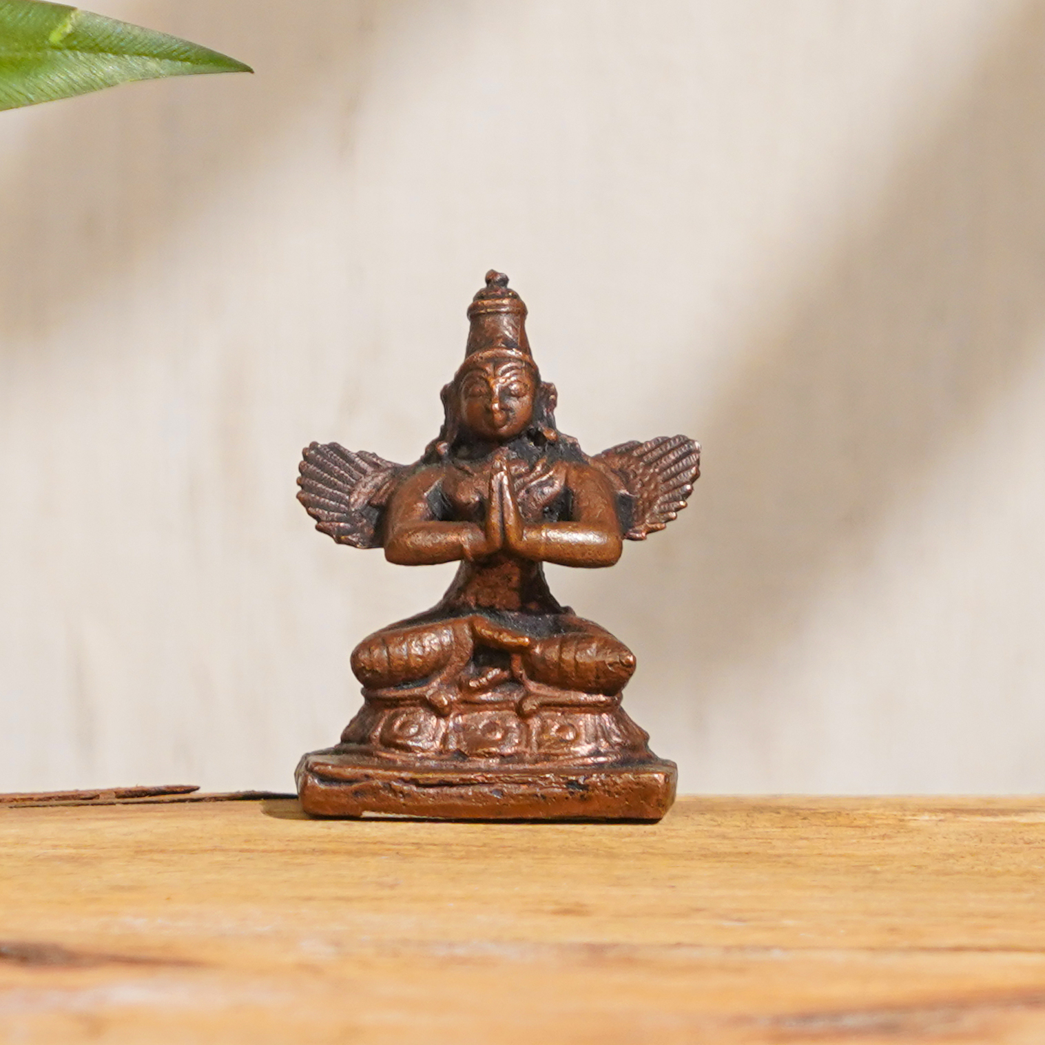 A beautifully handcrafted copper statue of Lord Garuda which depicts him sitting in Namaskar Mudra, a gesture of respect and reverence. The skilled Indian artisans who created this stunning piece paid attention to every intricate detail, ensuring that it is a high-quality representation of this important Hindu deity. Copper is believed to be an auspicious metal, adding to the significance of this statue. Lord Garuda is an important figure in Hindu mythology and is worshipped in many Indian temples. Having this statue in your prayer room at home or office can create a peaceful and spiritual atmosphere, promoting positive energy and harmony. This statue is not just a beautiful decorative piece, but also an auspicious gift for special occasions such as weddings, housewarming ceremonies, and other festive occasions. You can buy Lord Garuda statue online, and it will surely be a cherished gift for your loved ones. If you are looking for other god statues made of copper, you can also consider purchasing a copper Lord Hanuman statue. Overall, this handmade copper Lord Garuda statue is a must-have for anyone who wants to add a touch of divinity to their surroundings.