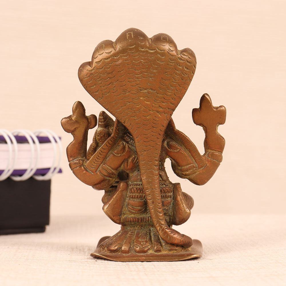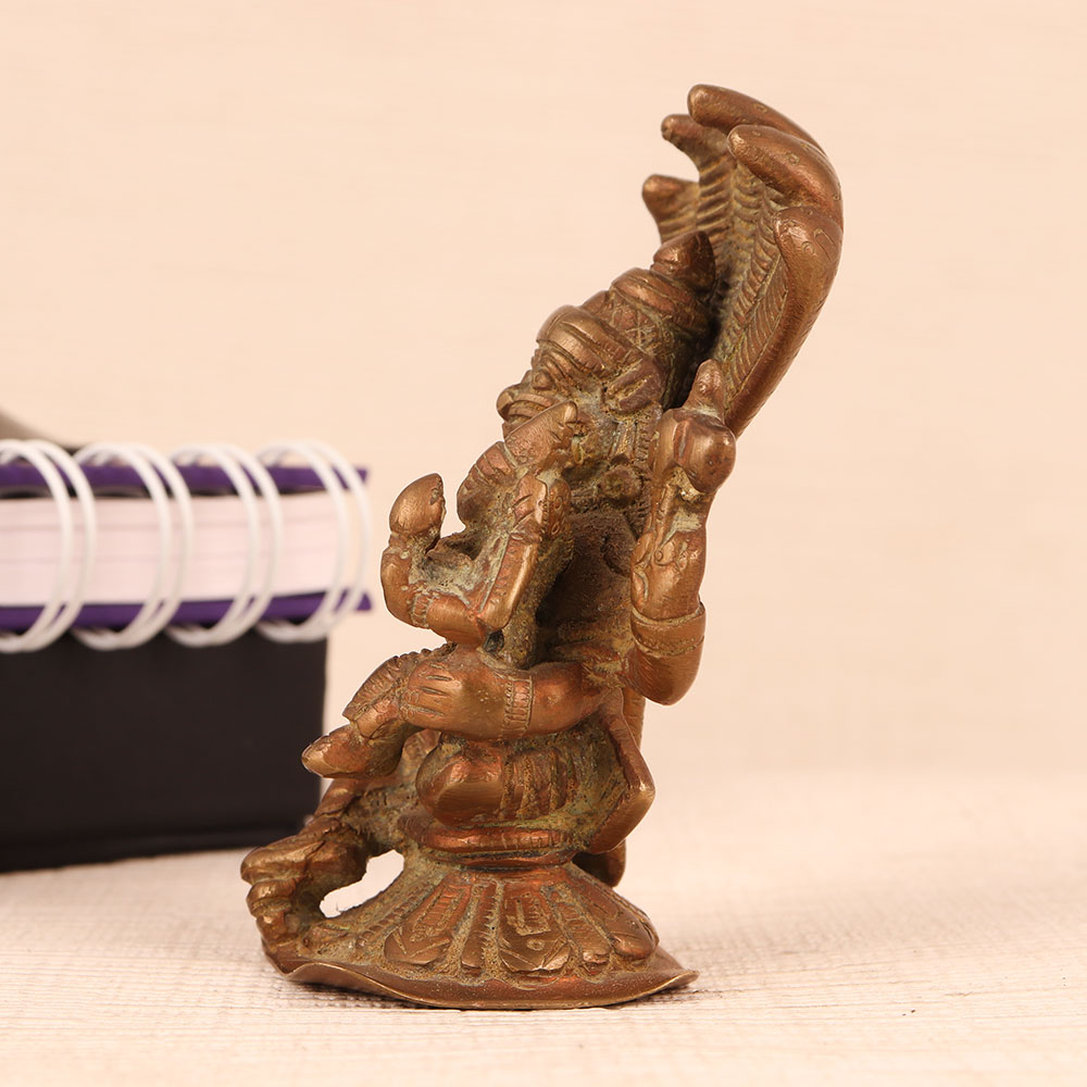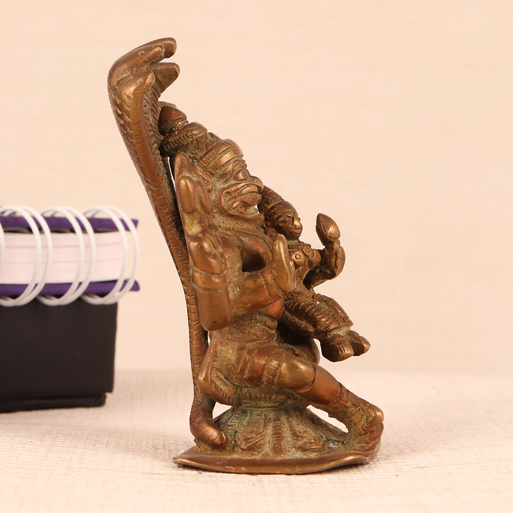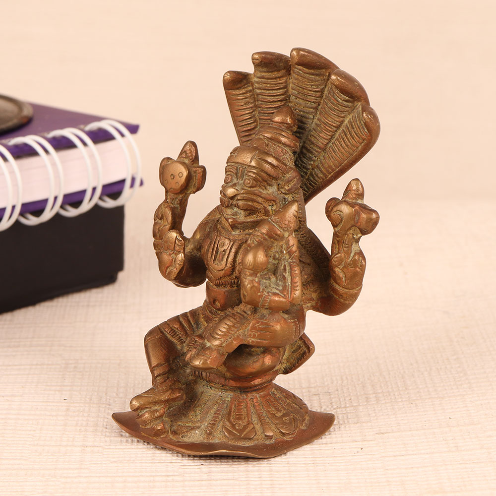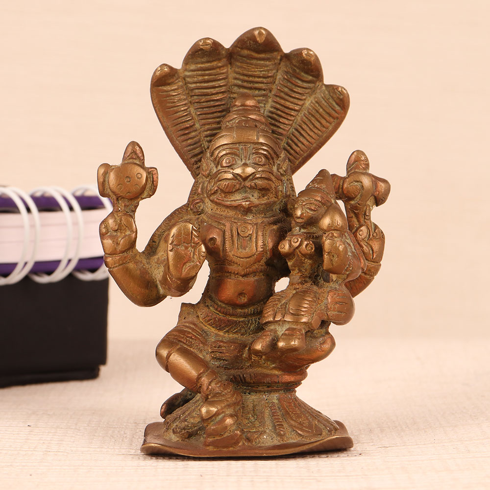 This Brass Statue of Lord Narasimha with Goddess Lakshmi is a magnificent piece of artistry that seamlessly blends spirituality, tradition, and craftsmanship. This exquisite masterpiece is handcrafted by skilled Indian artisans that embodies the essence of devotion and elegance. Crafted from high-quality brass, this statue showcases Lord Narasimha, the powerful incarnation of Lord Vishnu, sitting regally on a meticulously designed platform. What makes this piece truly unique is the presence of Goddess Lakshmi seated gracefully on his left lap, symbolizing prosperity and divine blessings. The antique brown finish adds a touch of timeless charm, making it a versatile addition to any space. Whether you're looking to enhance your home, office, restaurant, hotel, cafe, or shop's prayer room with an aura of spirituality and beauty, this statue is the perfect choice. Its intricate detailing and spiritual significance make it an ideal object of worship and decoration. For collectors of vintage treasures, it's a must-have addition to your collection. Furthermore, this statue serves as an exceptional gift for your loved ones on special, festive, or auspicious occasions. By gifting this Lord Narasimha and Goddess Lakshmi brass statue, you're not just sharing a piece of art; you're sharing blessings, prosperity, and a piece of Indian heritage.