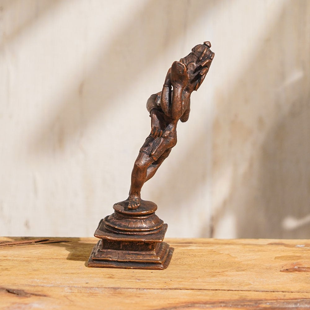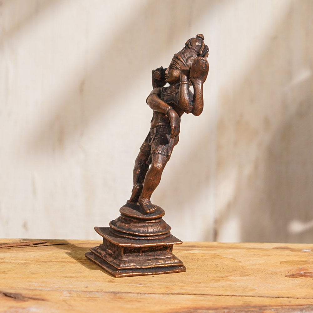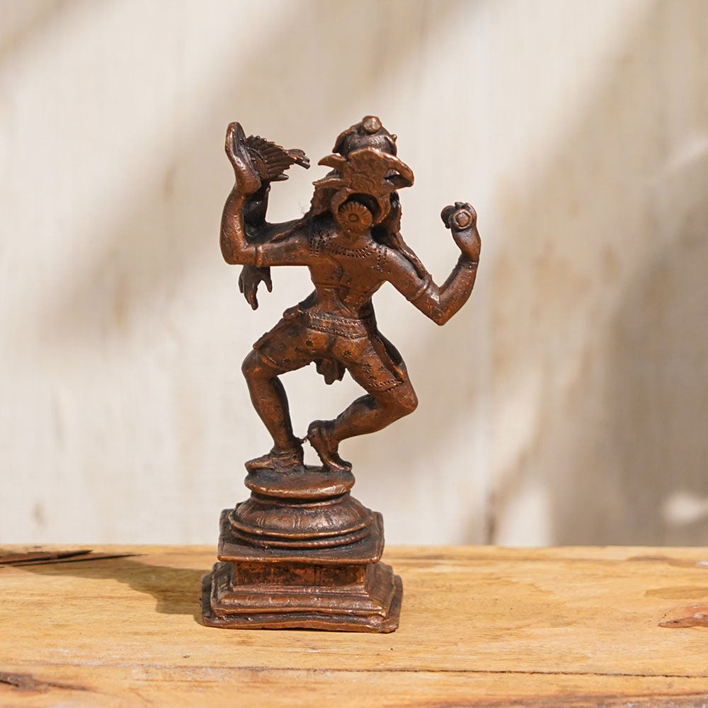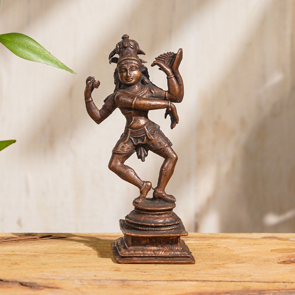 Immerse yourself in the divine cosmic dance of Lord Shiva with this stunning copper statue of Lord Nataraja. This exquisite idol captures the captivating depiction of Lord Shiva in his dynamic form, performing the Tandava, the cosmic dance of creation, preservation, and destruction. Handcrafted by professional Indian artisans with intricate details, this Lord Nataraja murti is a true masterpiece. Made with high-quality copper, this Lord Nataraja statue is not only a sacred symbol for worship, but also a captivating piece of art that can enhance any space with its divine aura. It is perfect for decoration, collection, or as a thoughtful gift for your family, friends, or relatives on special occasions. As you buy Lord Nataraja idol online, you invite the powerful energy and grace of Lord Shiva into your home. The intricately crafted details of Lord Nataraja's cosmic dance, with his iconic pose, flowing hair, and celestial aureole, make this copper statue a timeless representation of Hindu mythology. Embrace the spiritual significance of Lord Nataraja with this exquisite copper Lord Nataraja statue, a cherished addition to your home, collection, or as a unique gift for your loved ones, radiating the divine blessings of Lord Shiva's cosmic dance in your life.