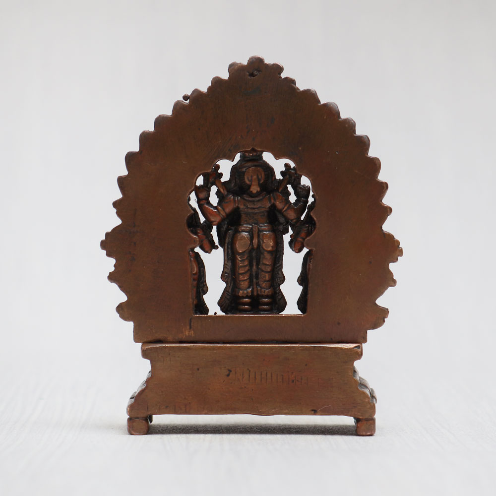 Buy this Lord Perumal Copper murti online and experience the divine presence of Lord Perumal, accompanied by his consorts Sridevi and Bhudevi, and Lord Garuda gracefully positioned in front. Meticulously handcrafted by local Indian artisans using high-quality copper, this masterpiece showcases a vintage-style finish that adds a touch of elegance to any space. Ideal for your prayer room at home, office, restaurant, cafe, or shop, this stunning Indian god statue boasts eye-catching detailing, making it perfect for exhibitions, decorations, and collections. Enhance the ambiance of your temple with this captivating sculpture, enhancing your worship experience. Looking for a thoughtful gift? This Lord Perumal statue is a splendid choice for special, festive, or auspicious occasions.
