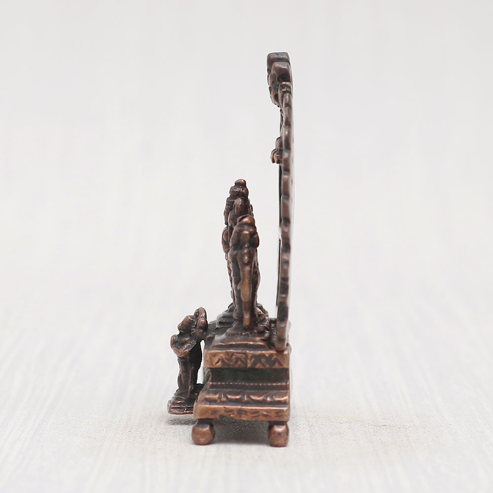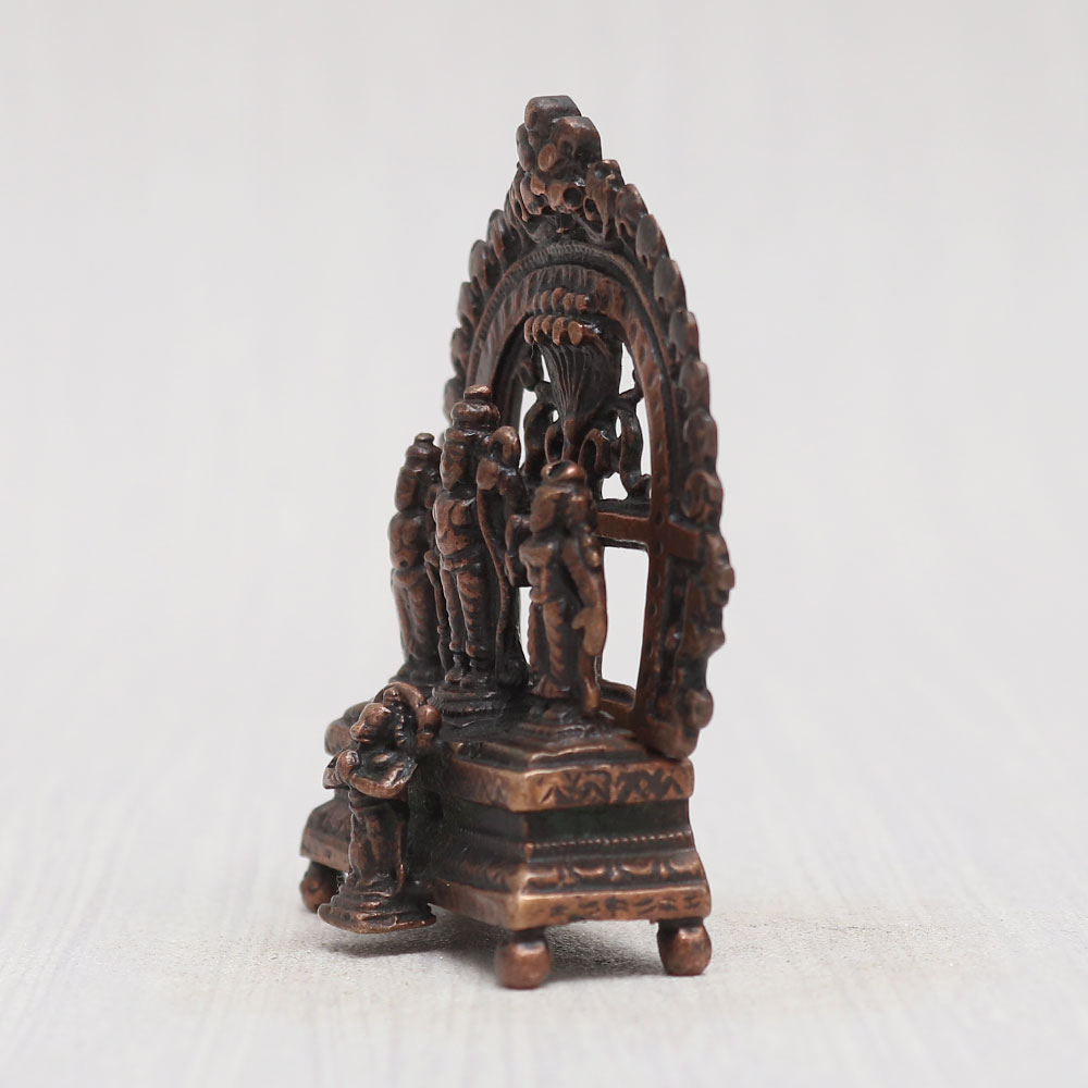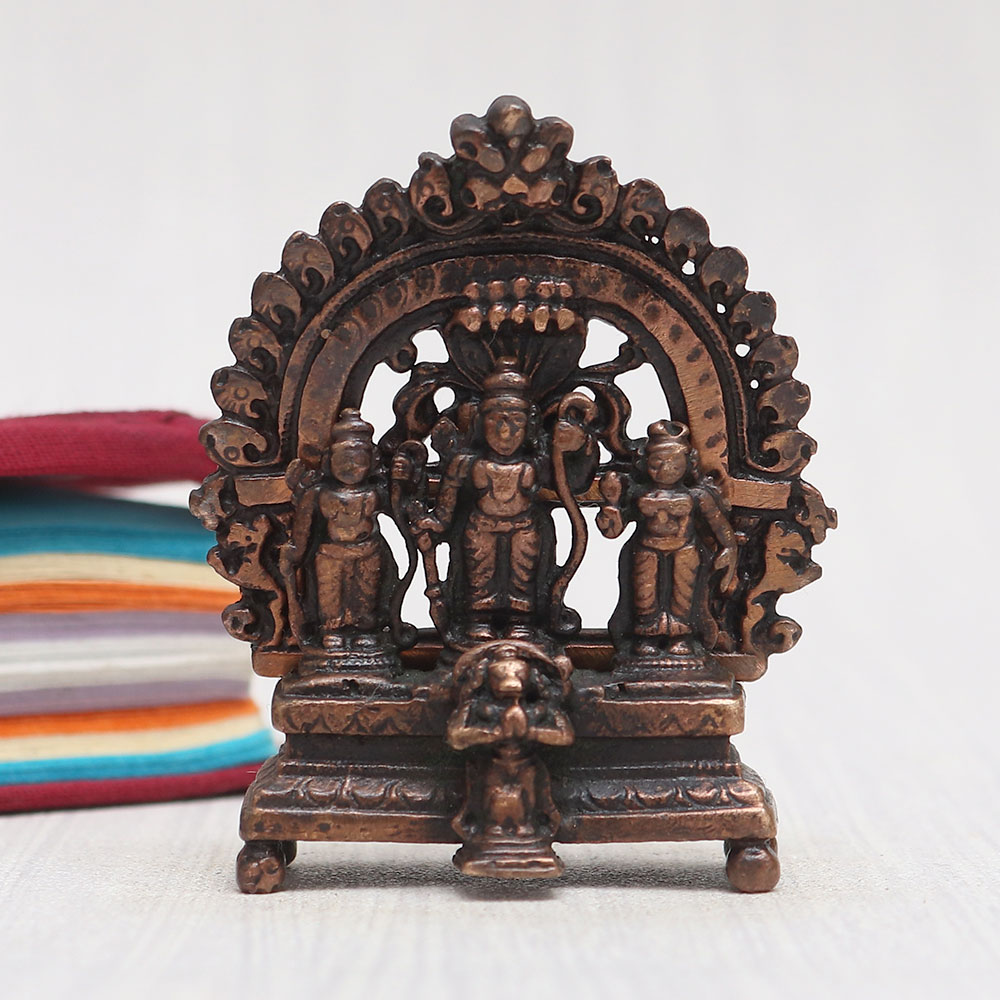 A copper statue of Lord Ram Darbar that is a divine portrayal of Lord Ram, Lord Laxman, and Goddess Sita graced by the presence of the devoted Lord Hanuman. Crafted with precision and passion by talented Indian artisans, this masterpiece is sculpted from high-quality copper and adorned with a vintage-style finish. Perfect for your prayer room at home, office, restaurant, cafe, or shop, this remarkable creation stands on a beautifully crafted platform with an intricately designed prabhavali. Embrace the divine blessings as you place it in your temple for worship or gift it to your loved ones on special, festive, or auspicious occasions. Discover a wide range of Hindu idols and god statues for home mandirs online on our website.