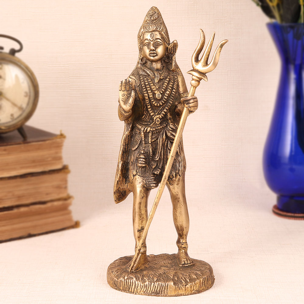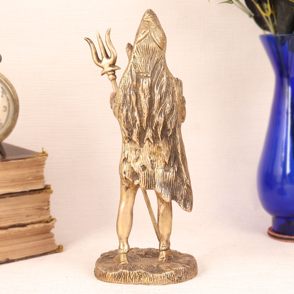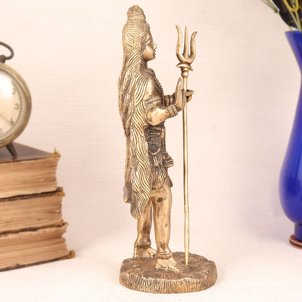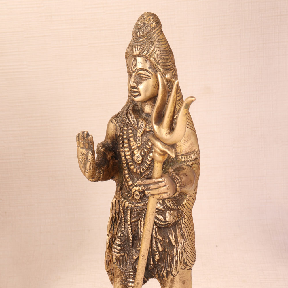 Enhance your decor with the timeless grace of our vintage brass statue of Lord Shiva. This exquisite masterpiece is handcrafted by highly talented Indian artisans, embodies the essence of Himalayan artistry. Standing majestically with his divine trishul in hand, Lord Shiva exudes an aura of serenity and strength, capturing the very essence of this revered deity. Meticulously crafted from high-quality brass, the antique brown finish adds an aura of authenticity and character, making it a true collector's item. Whether you seek to adorn your home, office, restaurant, hotel, shop, or cafe's prayer room, this statue serves as a powerful symbol of spiritual energy and devotion. Lord Shiva, the lord of destruction and transformation in Hinduism, represents the cyclical nature of life. His presence can inspire introspection and a deeper connection to the divine. This stunning piece also finds its place as a decorative marvel, enhancing the aesthetics of any setting. Perfect for vintage collectors and a captivating exhibit at any event or exhibition, it tells a story of centuries-old craftsmanship. Furthermore, it makes for an unforgettable gift for your loved ones on special, festive, or auspicious occasions, carrying with it the blessings and symbolism of Lord Shiva himself.