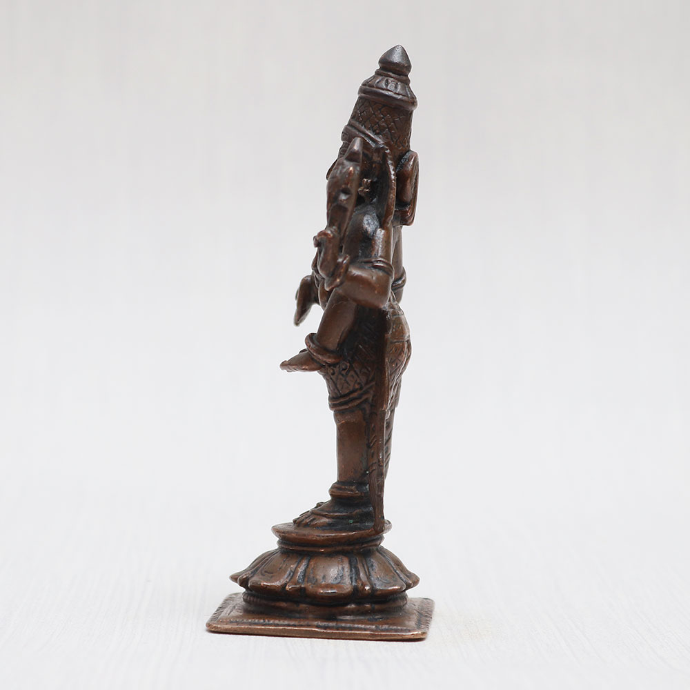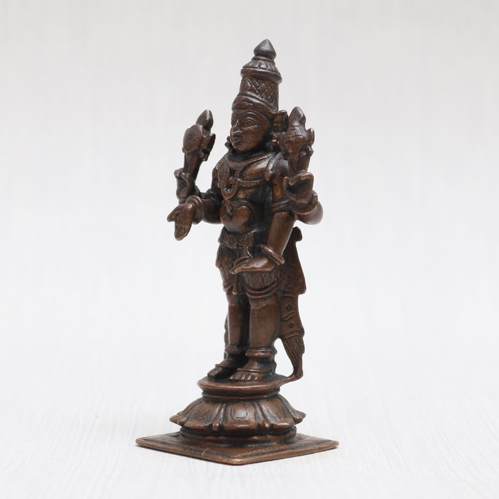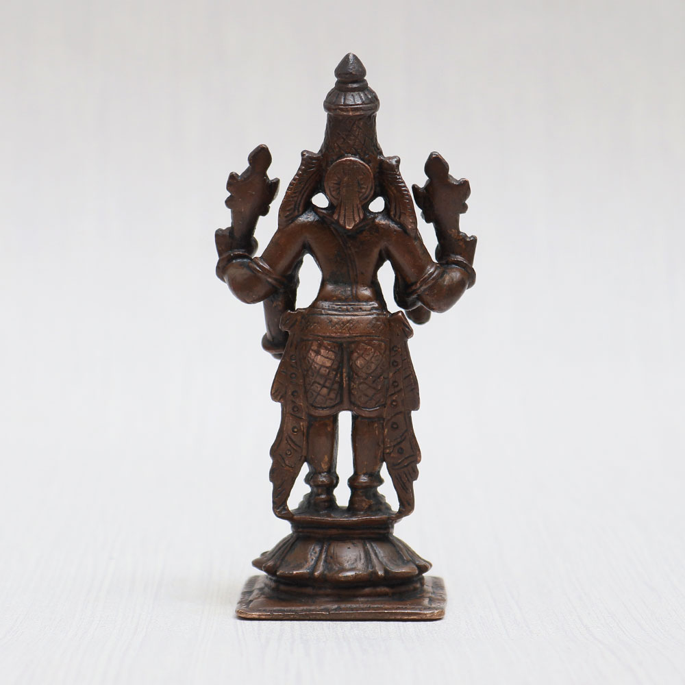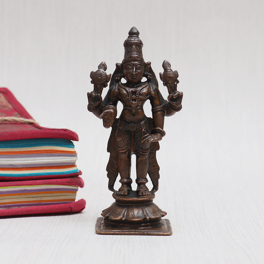 This exquisite copper Lord Vishnu standing statue is a masterpiece crafted with utmost skill and devotion by talented Indian artisans. Fashioned from high-quality copper, this divine statue showcases a vintage-style finish that exudes an aura of timeless grace and reverence. Perfect for your prayer room at home, office, restaurant, cafe, or shop, this god idol for home is designed with mesmerizing detailing. This Lord Vishnu statue serves multiple purposes, making it an ideal item for exhibition, decoration, and collection. Its spiritual significance also makes it a cherished addition to any temple for worship. Furthermore, this captivating piece makes for an unforgettable gift to your loved ones on special, festive, or auspicious occasions, symbolizing blessings, protection, and divine grace. Embrace the divine presence with this copper Lord Vishnu statue and let its aura of serenity fill your sacred spaces.