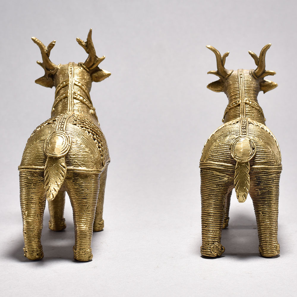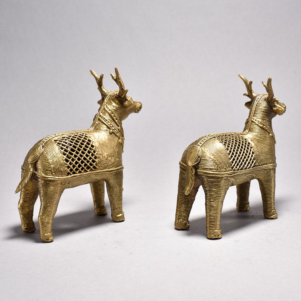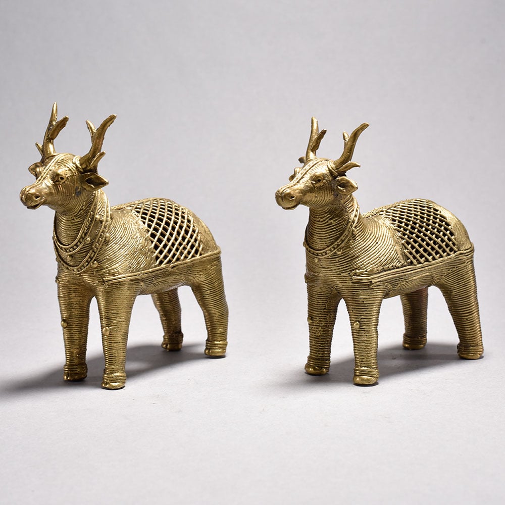 Bring home the timeless charm of traditional Indian craftsmanship with this beautifully handcrafted Metal Dhokra Deer Statue Pair. Made using the ancient lost-wax casting technique, each deer showcases intricate detailing and a stunning jali (lattice) pattern that highlights the artisans skill and cultural heritage. The warm brass-toned finish adds a rustic yet elegant appeal, making these statues perfect for both modern and traditional interiors. Ideal for living rooms, sideboards, office desks, entryways, or festive dcor, this Dhokra deer pair instantly uplifts the ambiance with its artistic presence. The statues represent harmony, grace, and prosperitymaking them an excellent gift choice for housewarmings, anniversaries, festive celebrations, or for collectors of tribal and ethnic art. Thoughtfully crafted by skilled tribal artisans of India, each piece is completely handmade, ensuring slight variations that enhance its uniqueness and authenticity. These statues are not just dcor items but meaningful pieces of art that bring cultural richness into your home. Durable, elegant, and visually striking, this Metal Dhokra Deer Pair is a true embodiment of traditional artistry blended with timeless design.