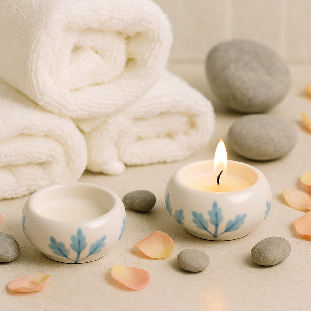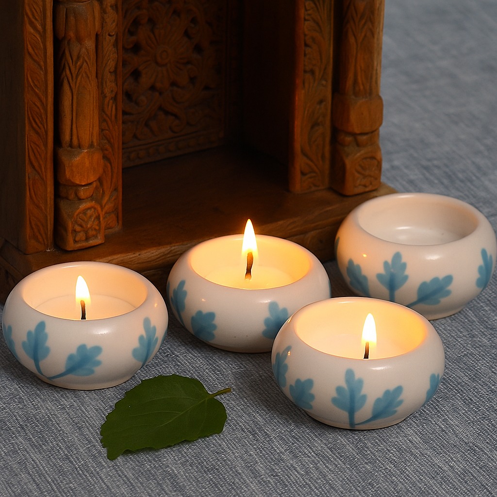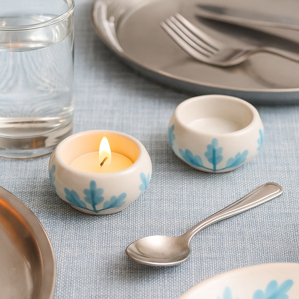 Enhance the ambiance of any space with our exquisite Ceramic Tea Light Holder. Meticulously crafted by highly skilled and experienced Indian artisans, this high-quality ceramic piece boasts a pristine white background adorned with a graceful sky blue leaf pattern, showcasing the seamless fusion of artistry and elegance. Tea light holders have long been cherished for their ability to infuse warmth and radiance into any setting. This piece is no exception, radiating a soothing glow that creates a serene atmosphere. Perfect for homes, restaurants, cafes, shops, or hotels, it adds a touch of sophistication to diverse environments. Whether you're celebrating a special occasion or seeking to create unforgettable moments with loved ones, our Ceramic Tea Light Holder is the classic decorative accessory. Its enchanting illumination provides a captivating backdrop, making cherished memories even more magical. Moreover, this exquisite creation isn't just for personal indulgence, it makes for an exceptional gift on special, festive, or auspicious occasions. Share the joy by presenting your loved ones with a token of artistry and warmth that will forever hold a place in their hearts.