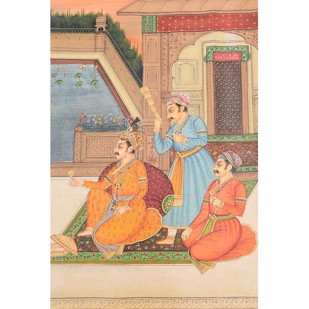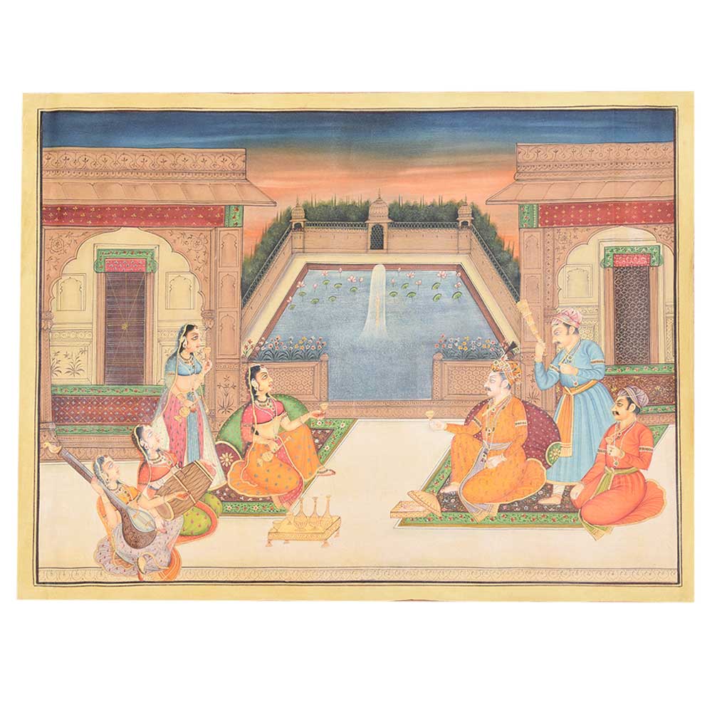 This beautiful Mughal Canvas painting shows how the emperor spent time with the queen. This painting is a masterpiece and a safe purchase to decorate the walls of your dream home or office.