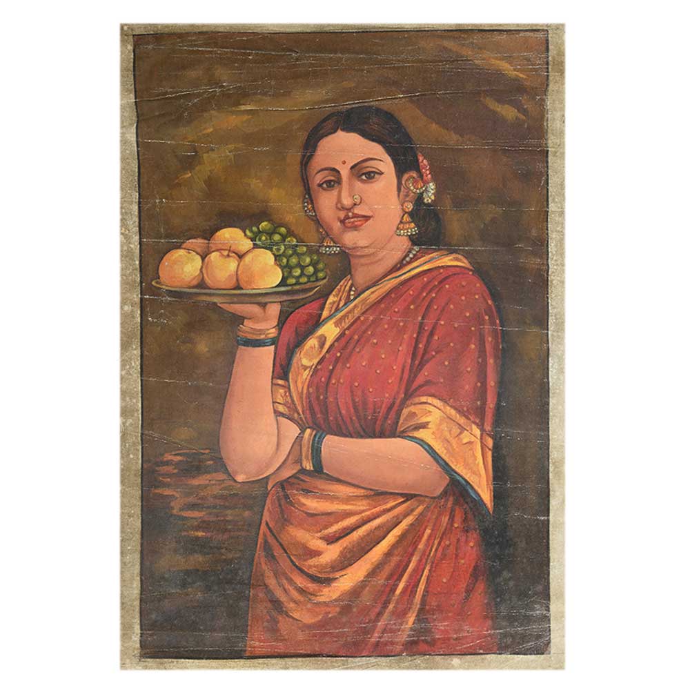 • Handmade Multicolored Indian Painting Of a lady Holding A Plate Of Fruits