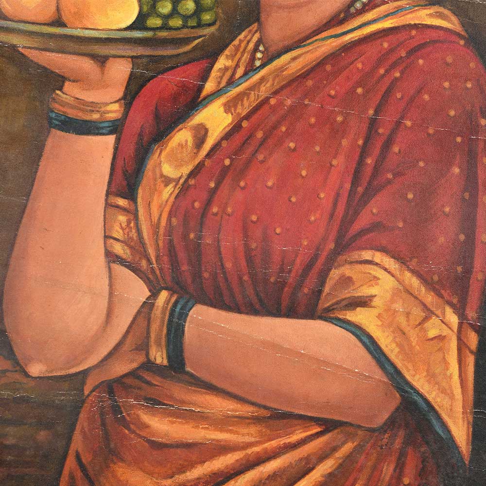 A handmade Indian canvas painting of a woman holding a plate of fruit for upholstery, office decoration as a gift to friends and family for housewarming, weddings and other occasions.