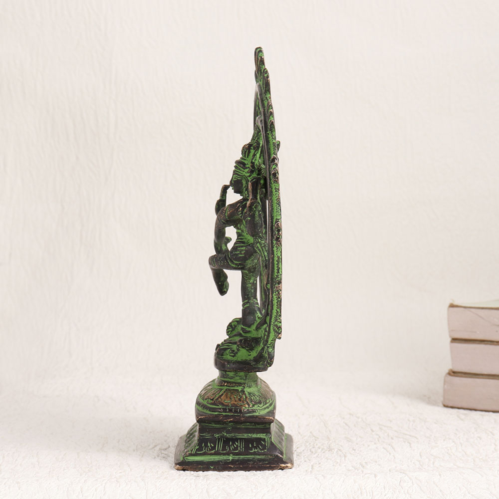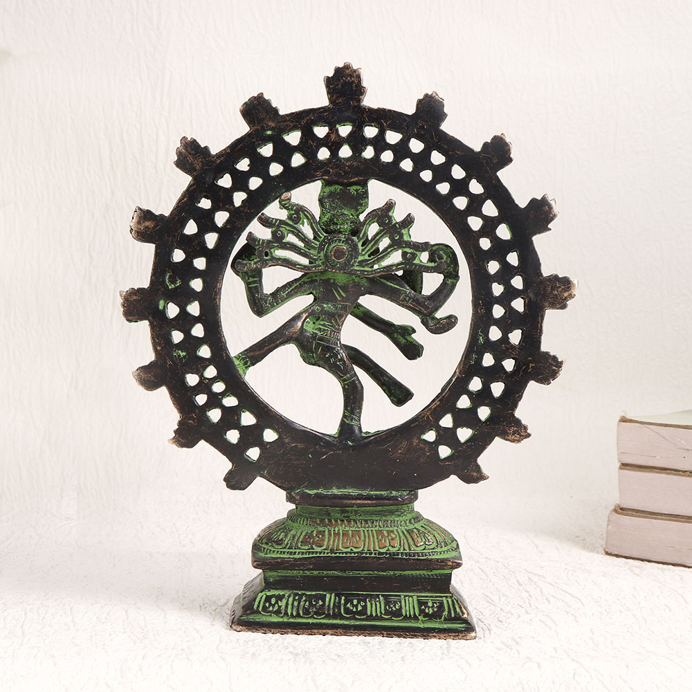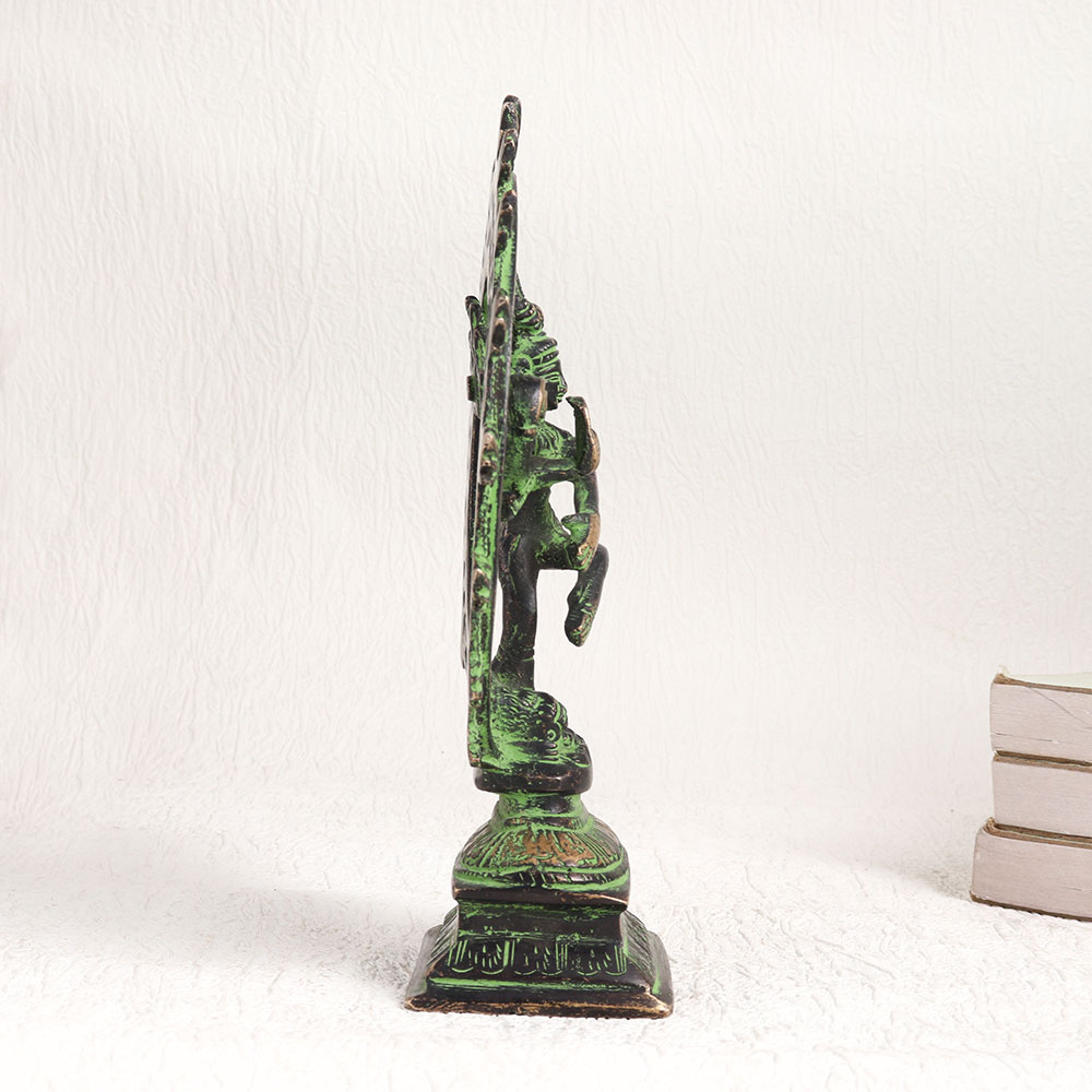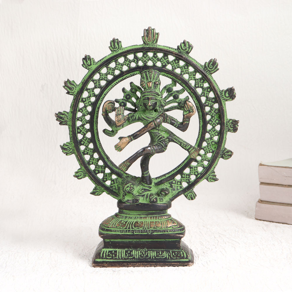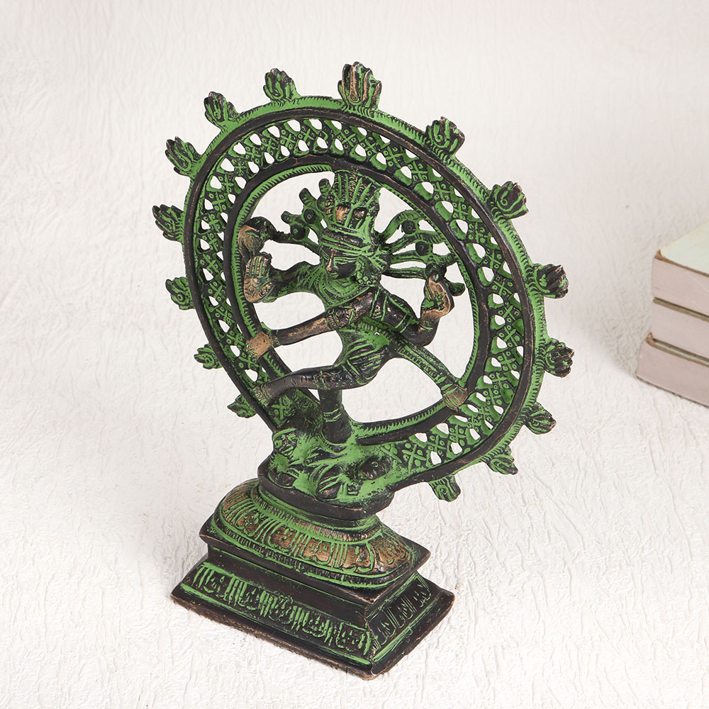 Enhance your space with the exquisite elegance of our brass statue depicting Natraja, the divine avatar of Lord Shiva. This captivating piece of artistry standing on a platform that beautifully captures the essence of Lord Shiva's cosmic dance known as the Tandava in an antique green and black finish. Crafted by highly talented Indian artisans, this masterpiece is a testament to their expertise and devotion. Handmade with meticulous attention to detail, this Natraja statue is fashioned from high-quality brass, ensuring its durability and timeless beauty. Versatile in its use, it can grace your home, office, restaurant, hotel, cafe, or shop, adding an aura of spirituality and sophistication to any space. Whether for worship or decoration, it exudes a sense of divinity and grace. This Natraja statue is also a treasure for collectors and can be a stunning addition to exhibitions. It makes for a thoughtful and meaningful gift for your loved ones on special, festive, or auspicious occasions, embodying the blessings and symbolism associated with Lord Shiva's divine dance.