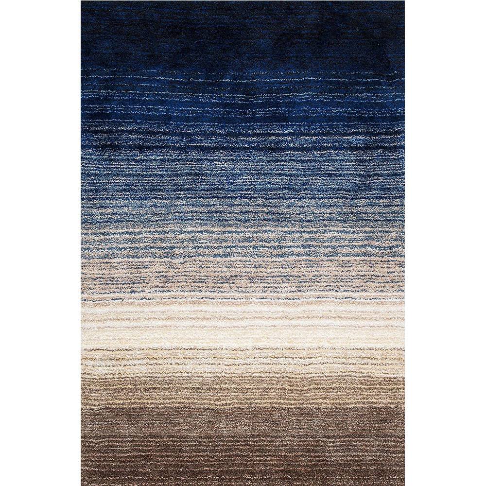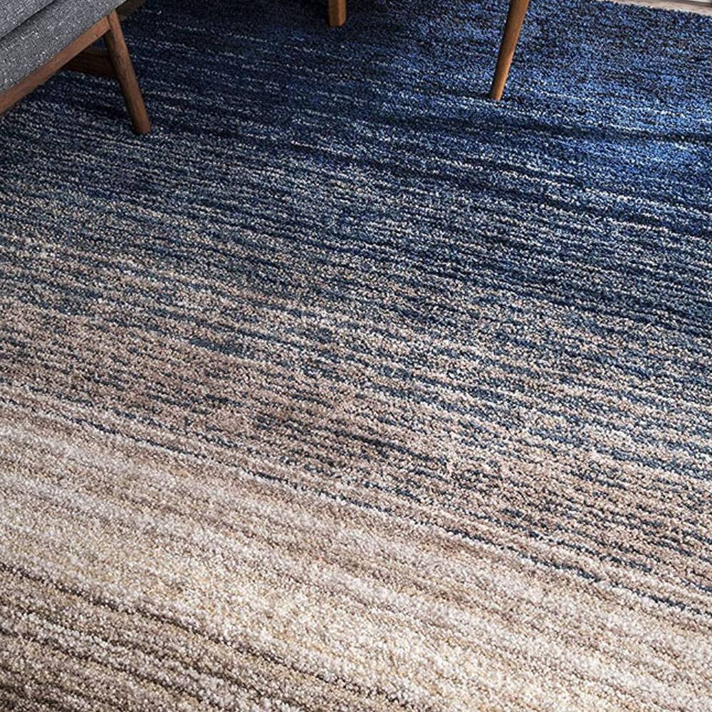 The gradual color blend from navy to beige adds visual depth and makes the rug versatile across decor styles.