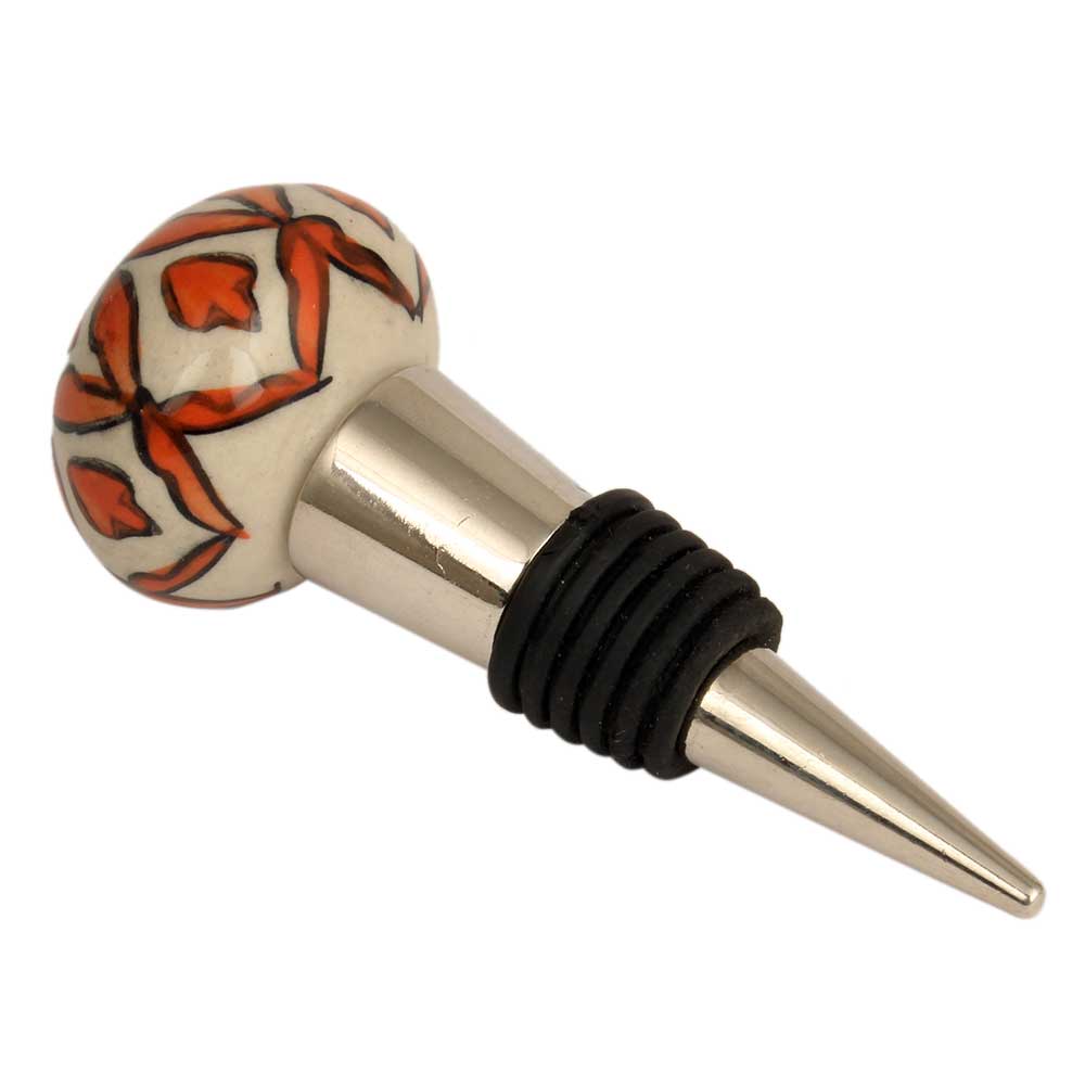 Handmade Orange Floral Ceramic Wine Bottle Stopper. Zinc Alloy Wine Bottle Stopper with Attractive Jute Bag Packaging.