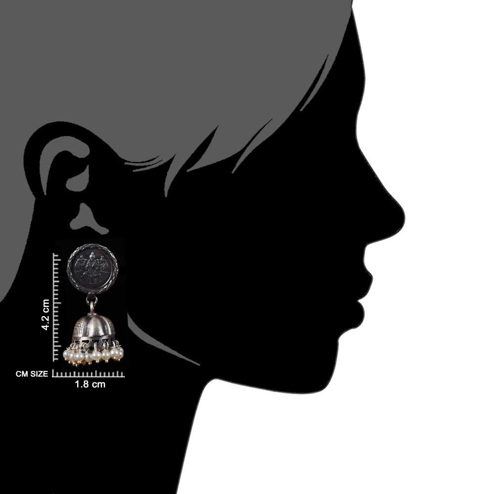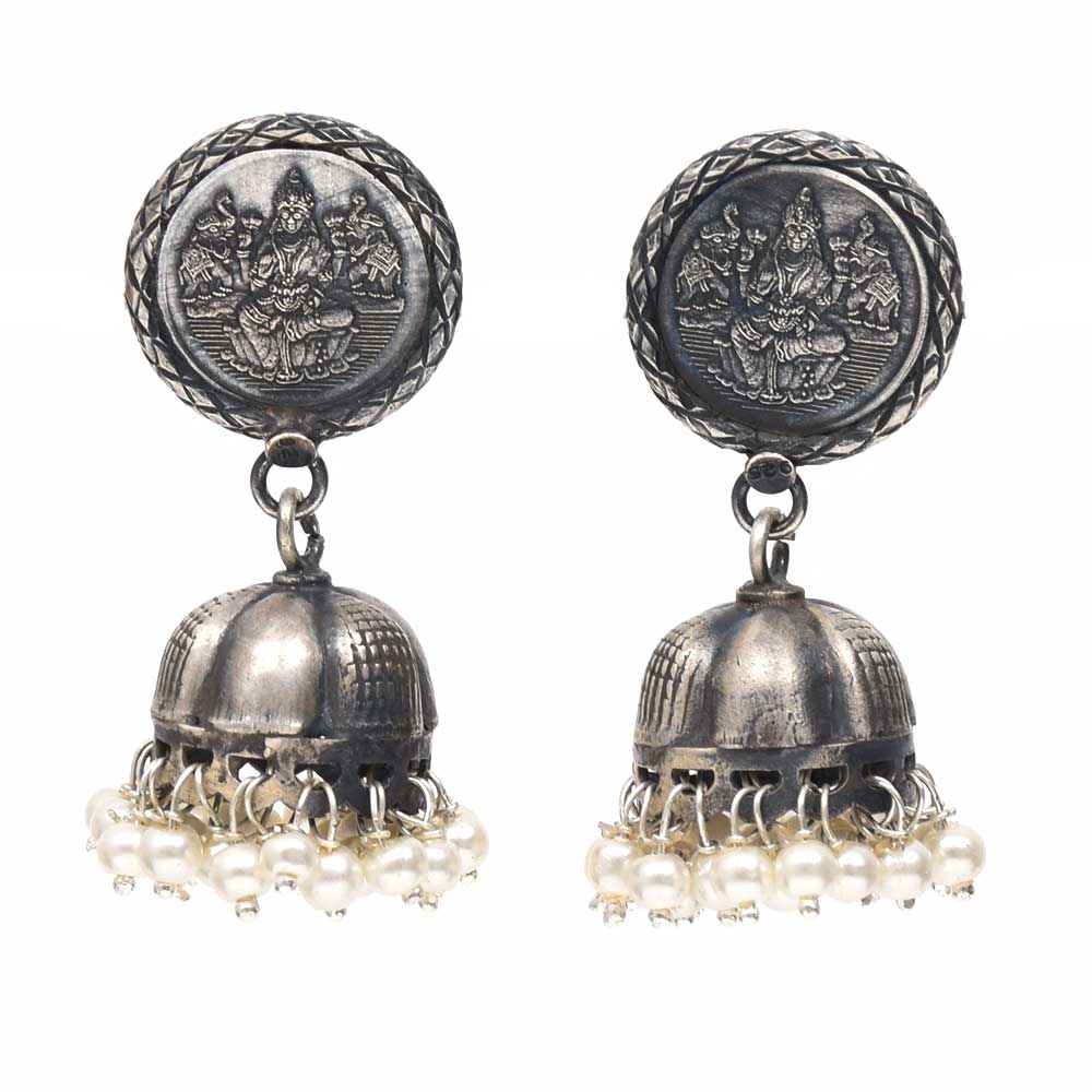 Handmade Oxidised Silver Laxmi On Coin Dome Shaped Jhumkas With Pearl Beads