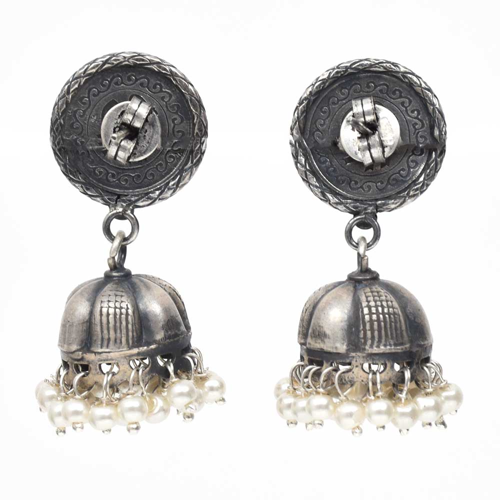 The handmade oxidized silver Laxmi engraved in coin dome-shaped jhumkis with pearl beads can be worn at weddings, engagements, bridal gifts or as a gift to your loved ones.