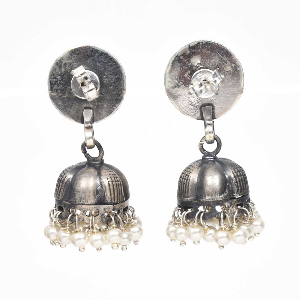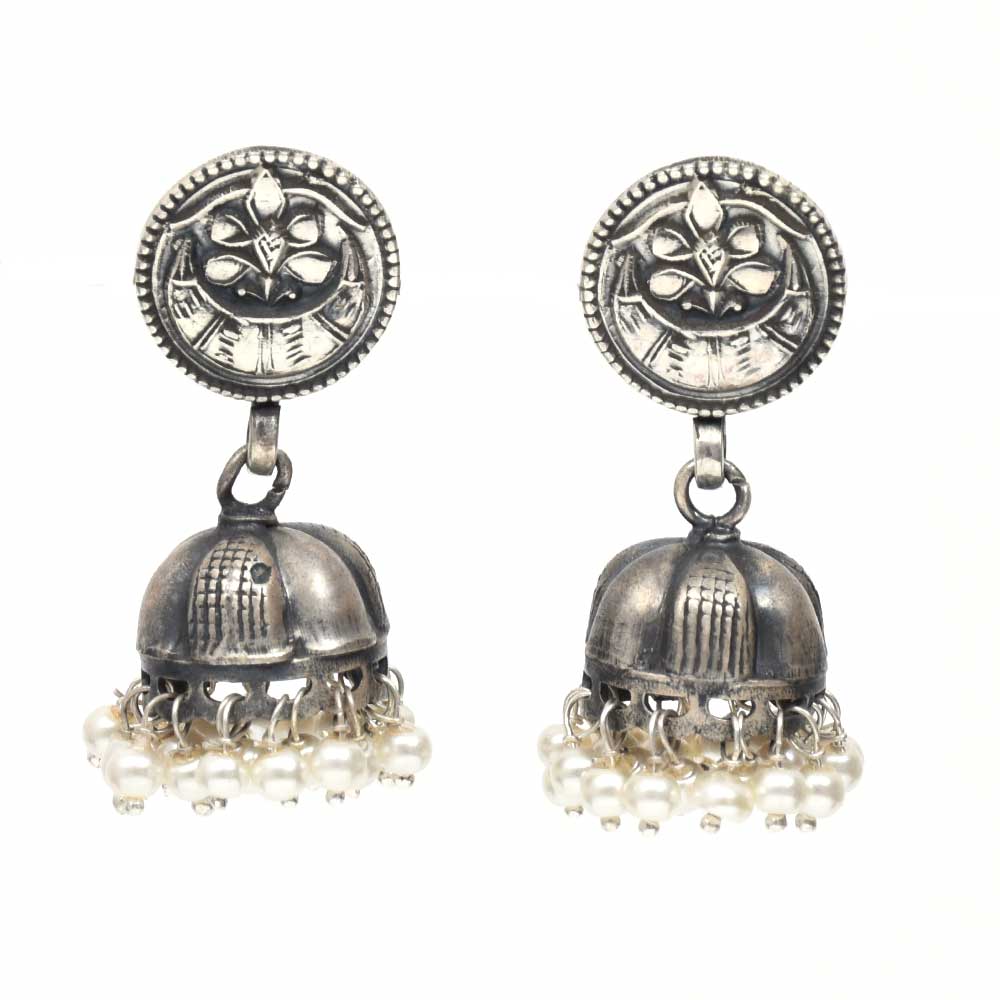 • Handmade Oxidized Silver Engraved Jhumki Earrings With Pearl Bead Hangings