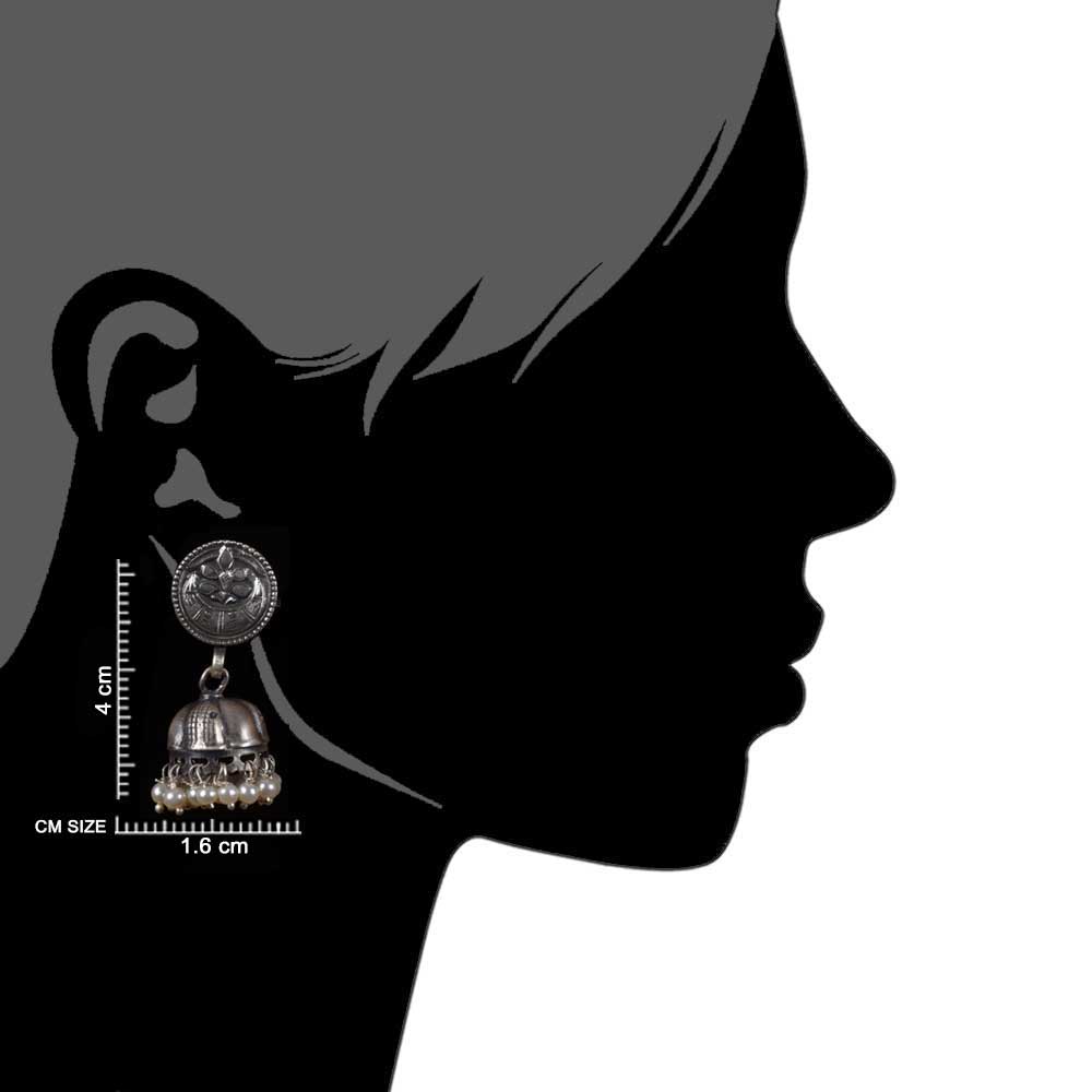 Handmade Oxidized Silver Engraved Jhumki Earrings With Pearl Bead Hangings