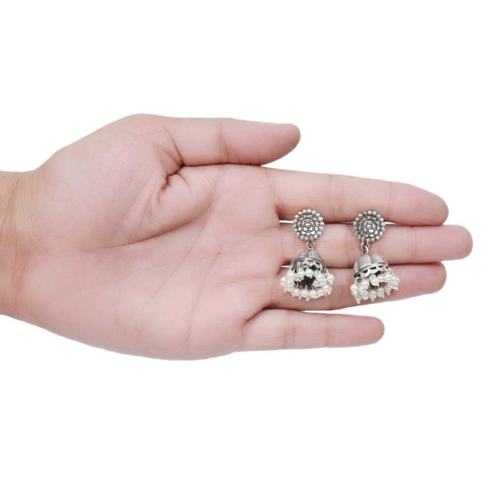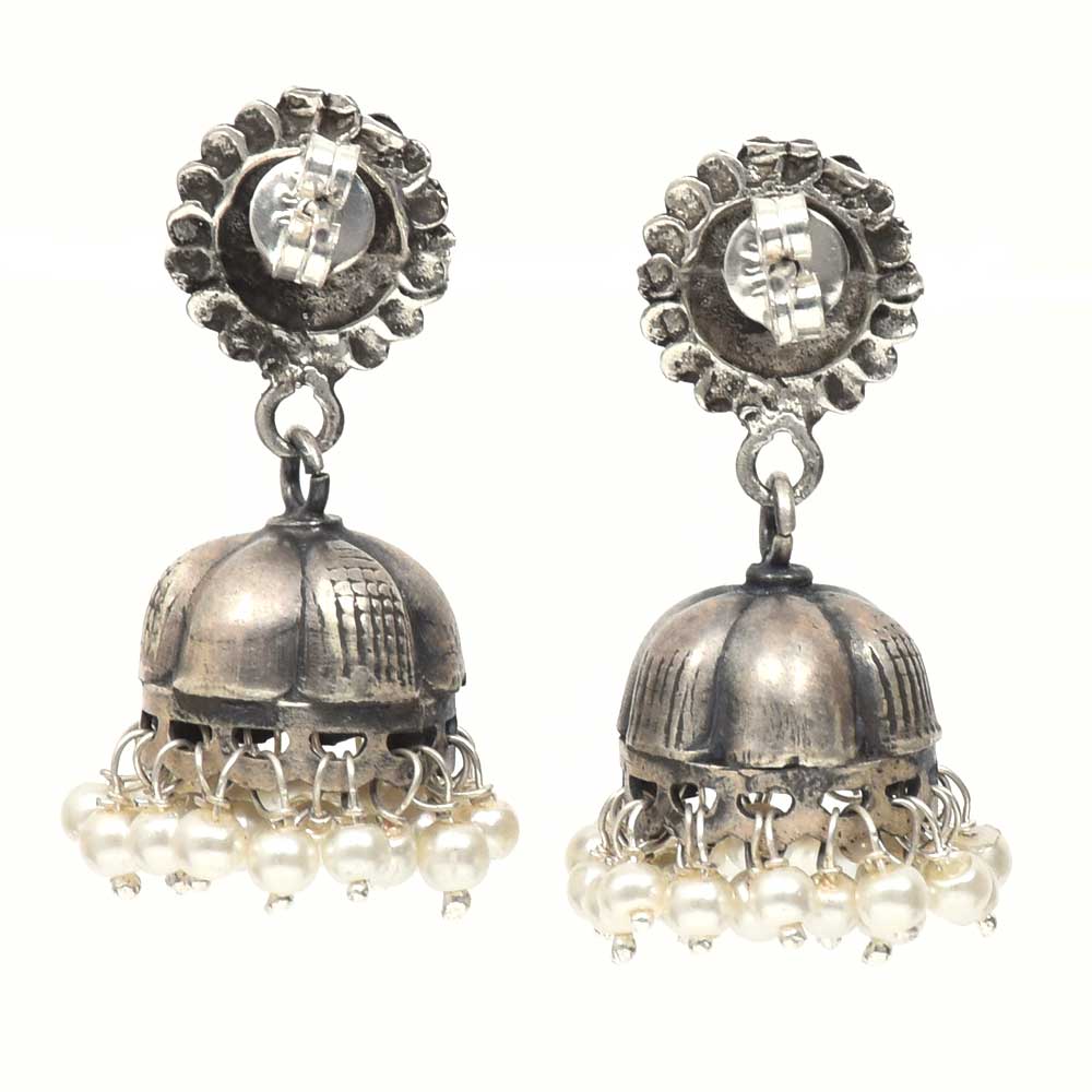 Handmade Oxidized Silver Floral Stud Jhumki Jhumka Earring With Pearl Beads