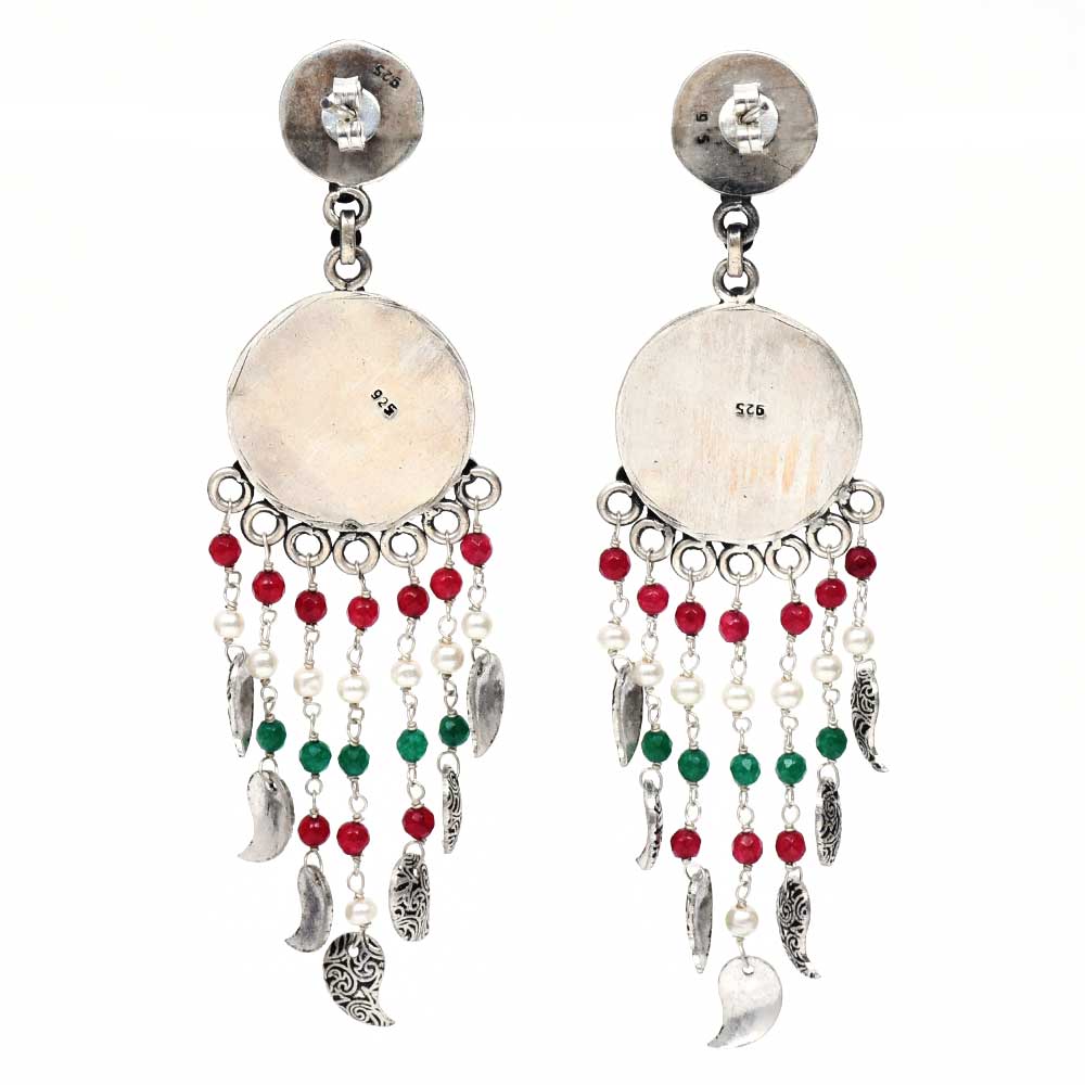 • Handmade Oxidized Silver Fringe Earrings With Flowers and Stones