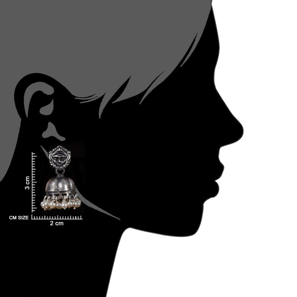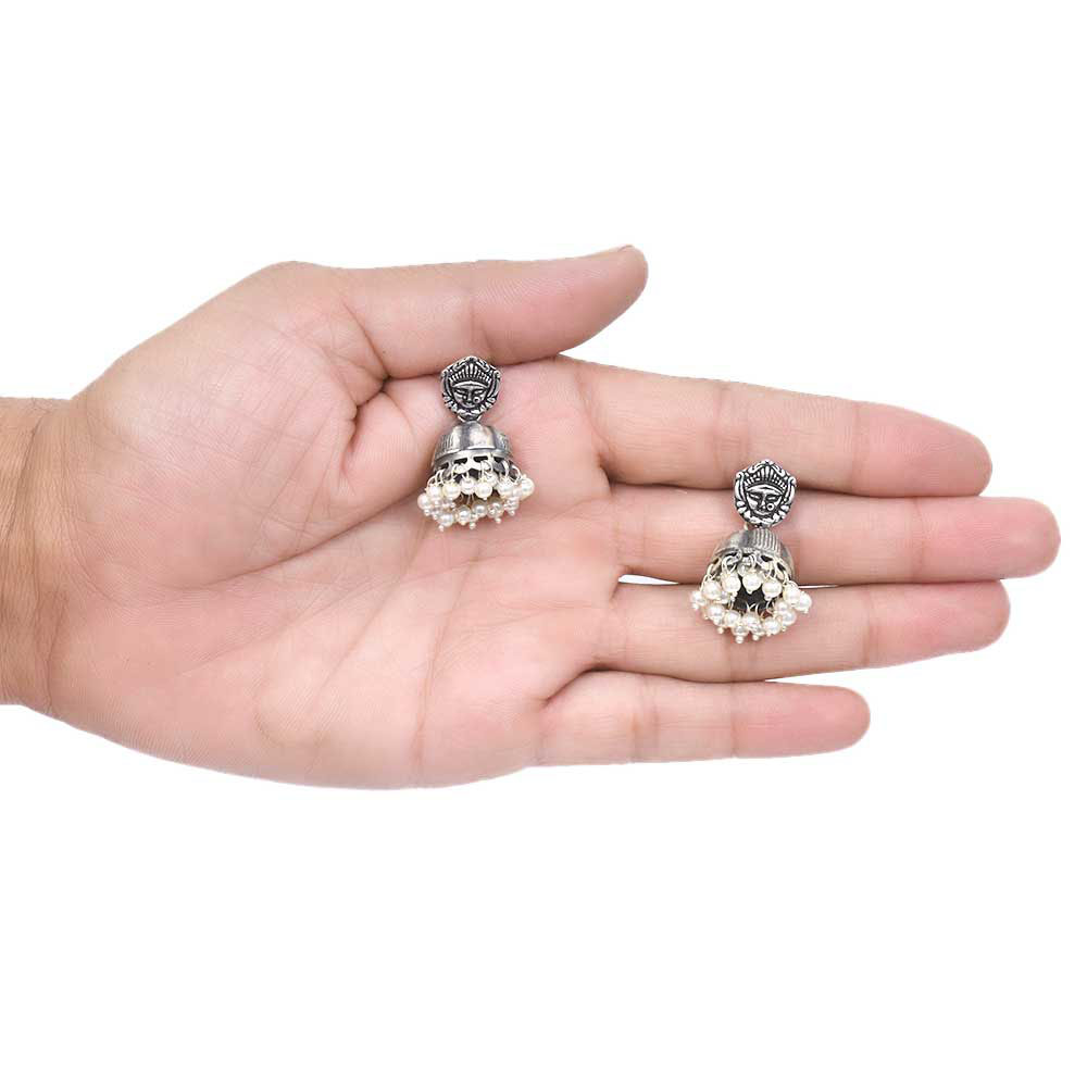 The face of Goddess Durga on the oxidized silver jhumki adds sacred essence to the beautiful earrings. It can be perfectly combined with any national costume or kurta and a casual gift for near and dear ones, friends and relatives.