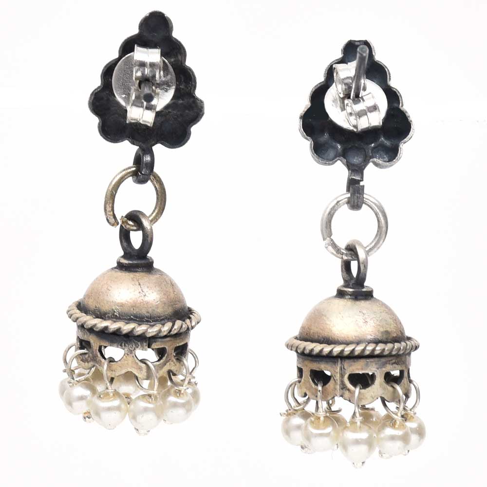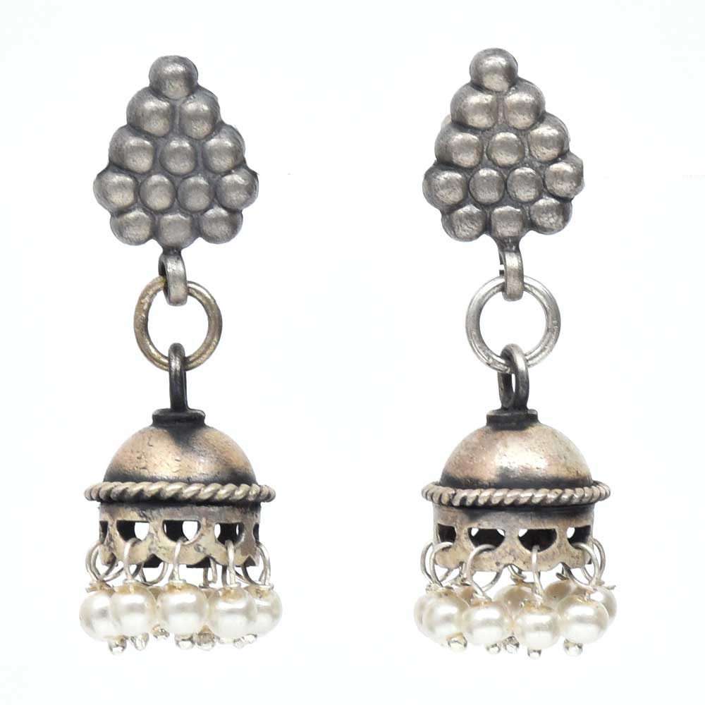 Handmade oxidized silver Jhumkis have grape cluster stud on top with white pearl hangings that boasts of ethnic traditional design and enchanting skills. Pair it with a white chest, raglan sleeve top, high-waisted, boot-shaped jeans or with any indian attire.