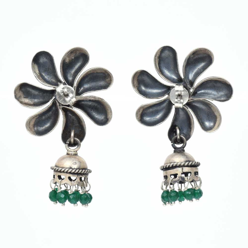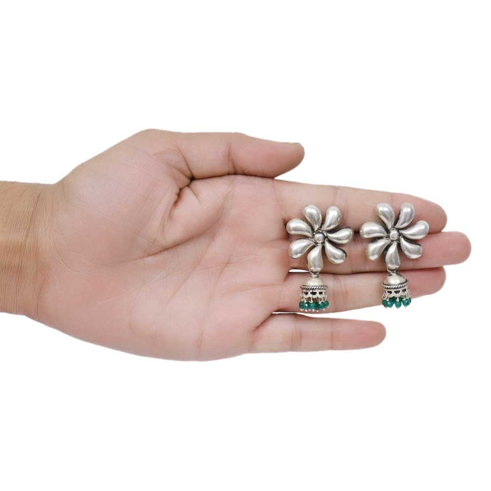 The handmade silver Jhumkis has a large flower as a stud, with oxidized silver Jhumkis, with green beads attached to the bottom of the Jhumkis. Pair with traditional Salwar suits, long skirts, or college or university and office dresses.