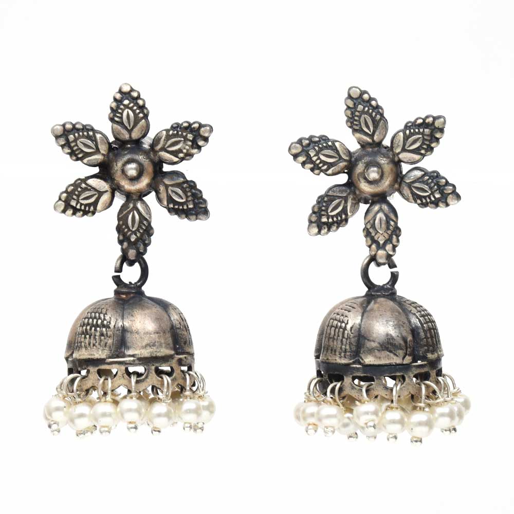 • Handmade Oxidized Silver Jhumkis With Big Petal Flower Stud Design And Pearl Hangings
