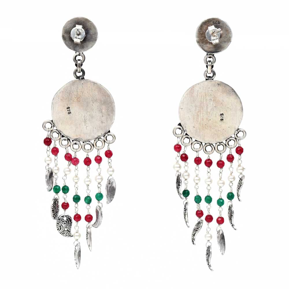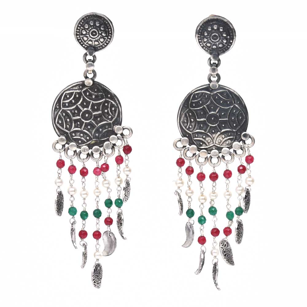 • Handmade Oxidized Silver Long Drop Dangle Earrings Embellished With Red And Green Beads