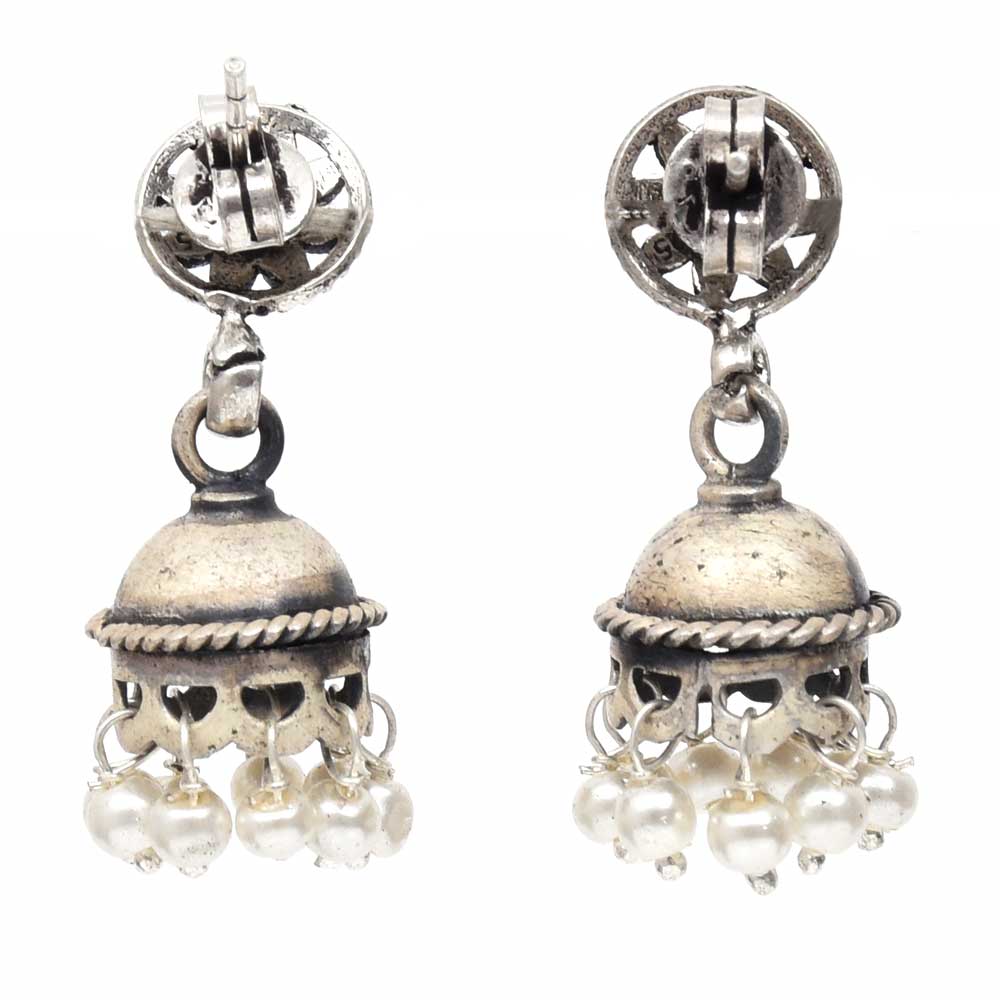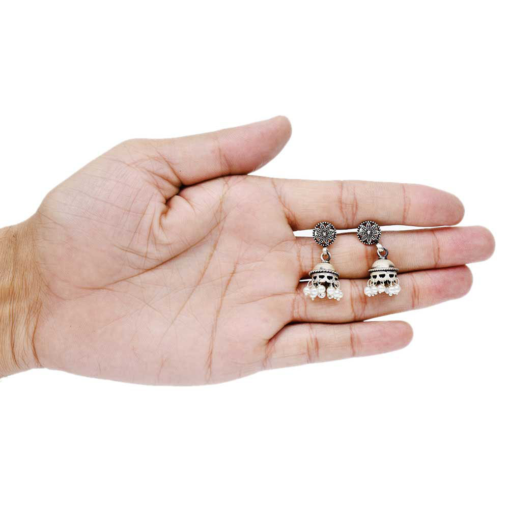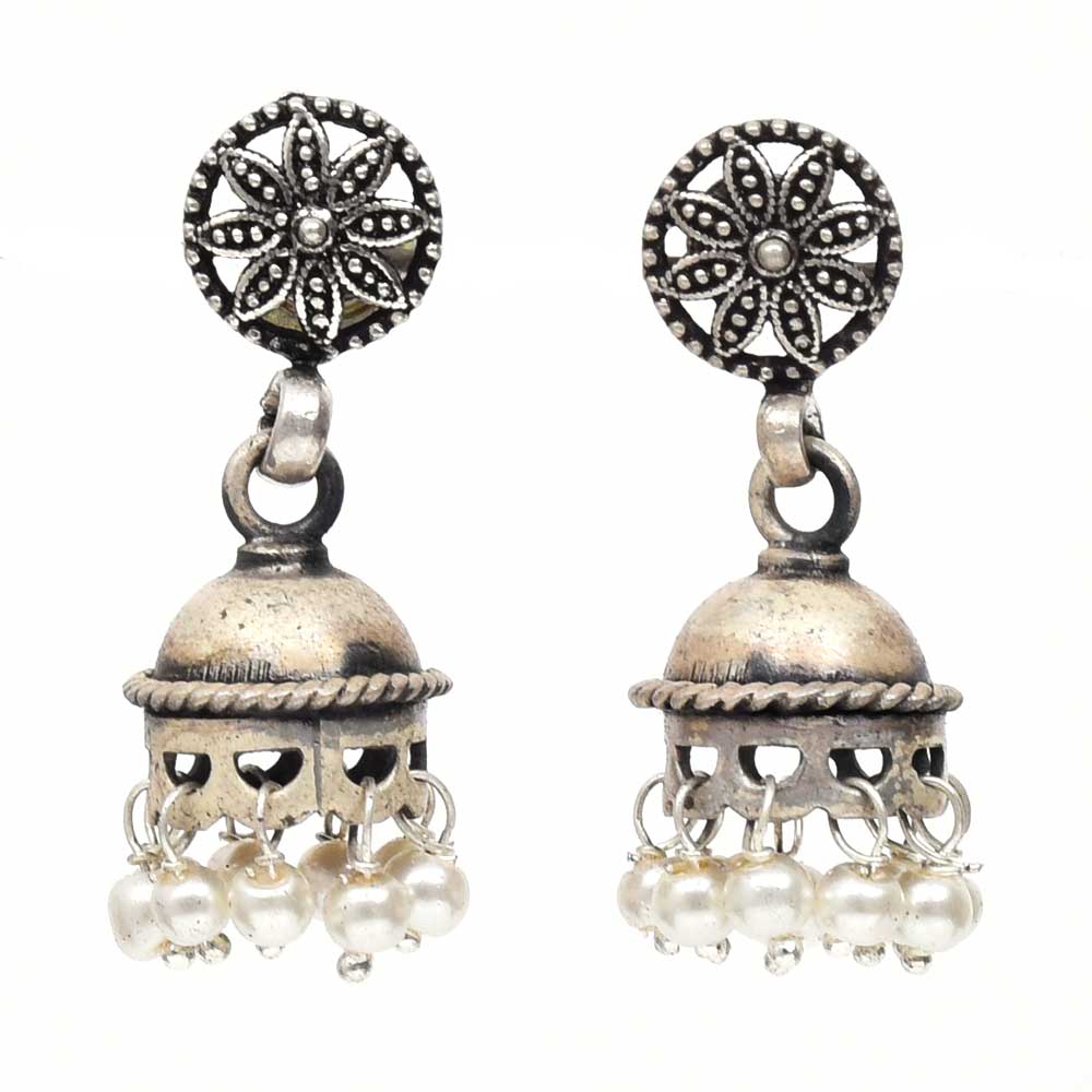 Handmade Oxidized Silver Pearl Floral Stud Jhumki Jhumka Earring
