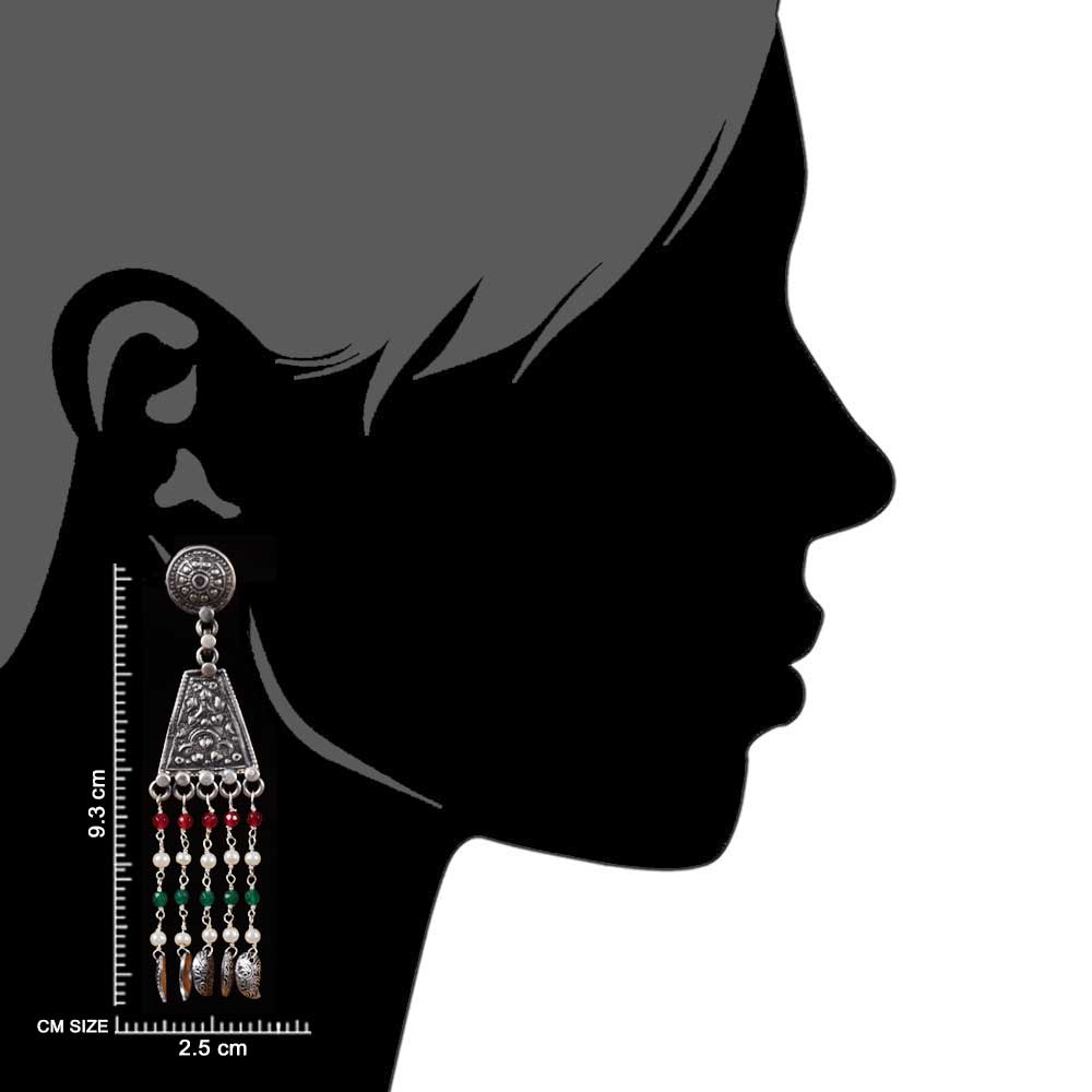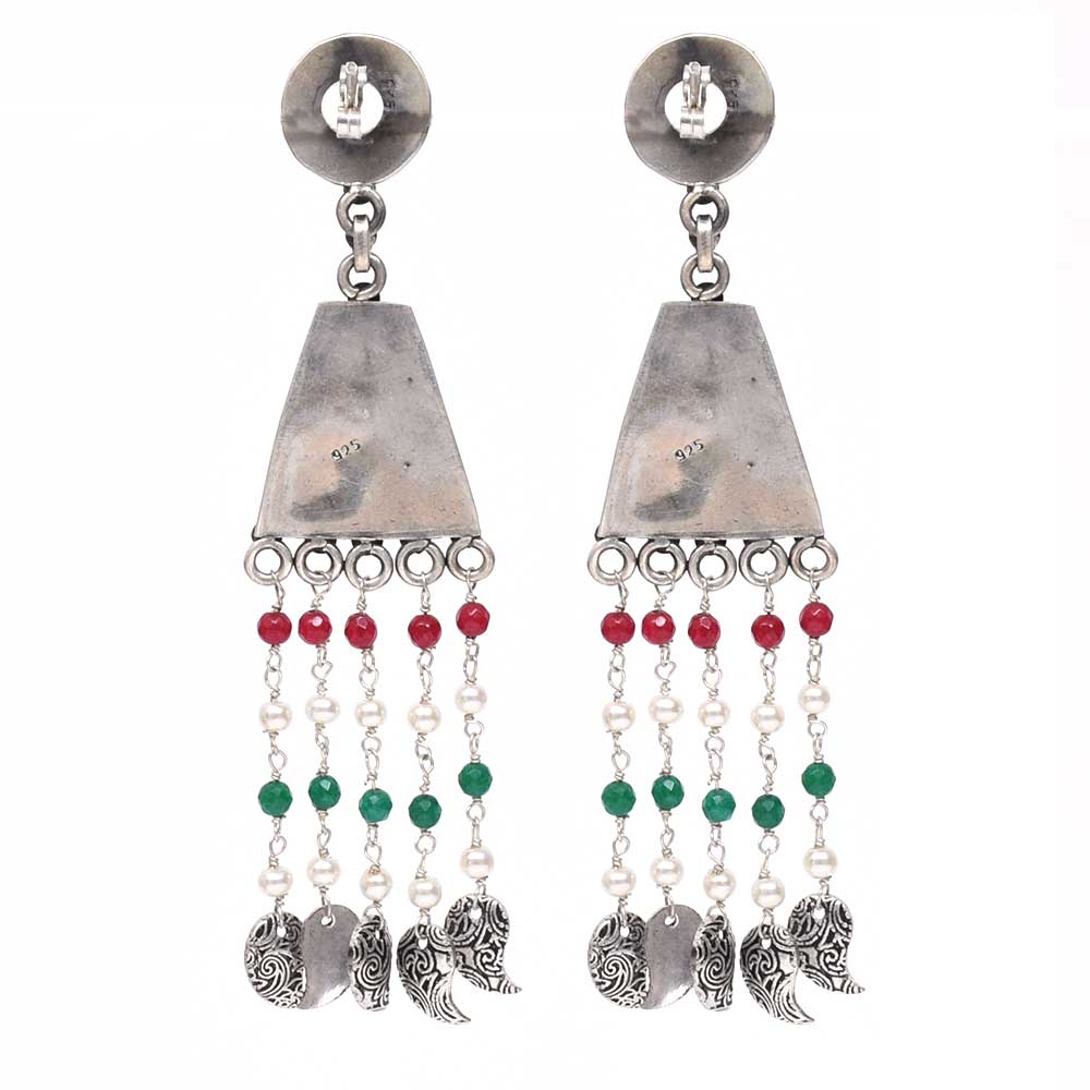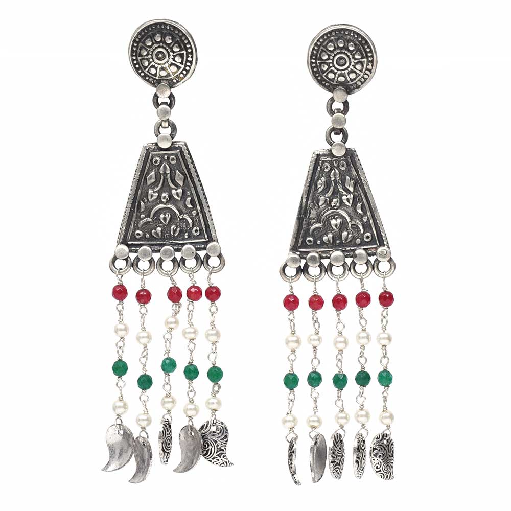 • Handmade Oxidized Silver Tassel Earrings With Red And Green Beads