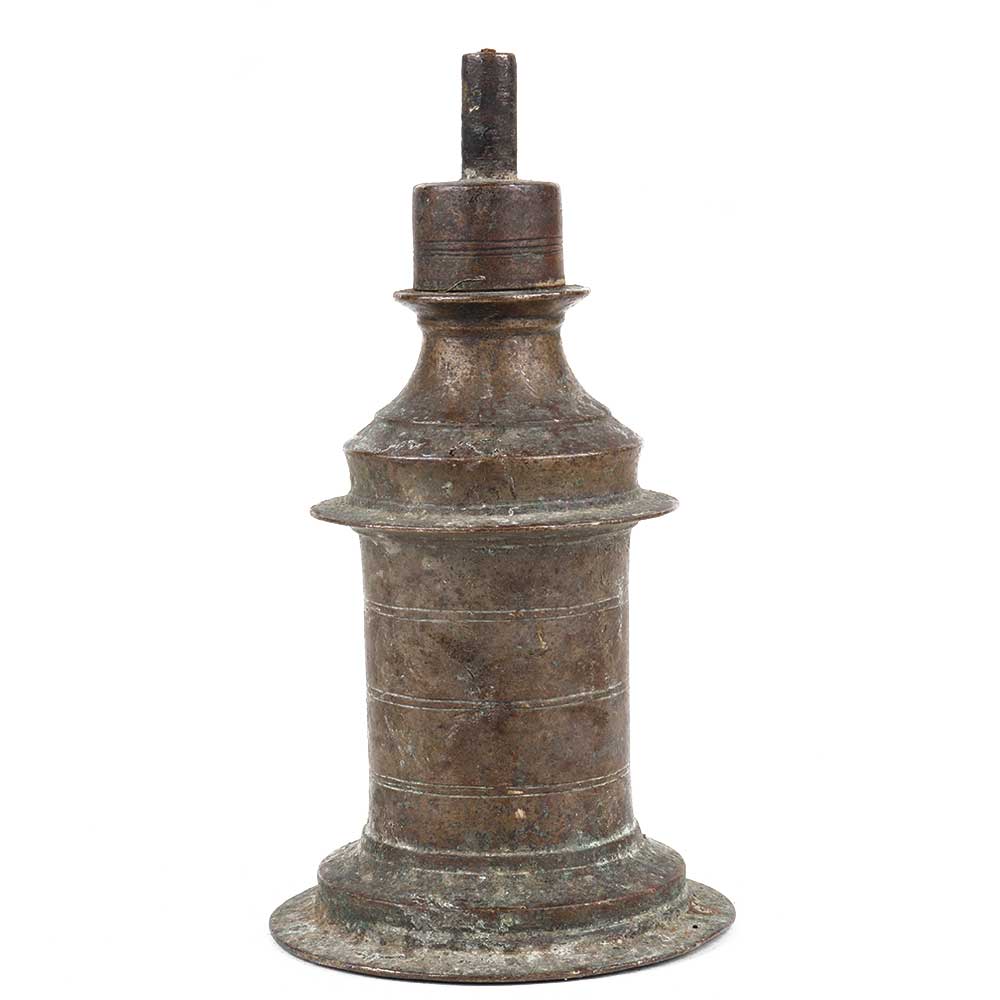 Long antique style brass oil lamp made by local craftsmen in India with a single-core opening at the top. Decorative artifacts showpieces for table displays, wedding gifts, stage decorations, interior decorations, office desks, gifts.