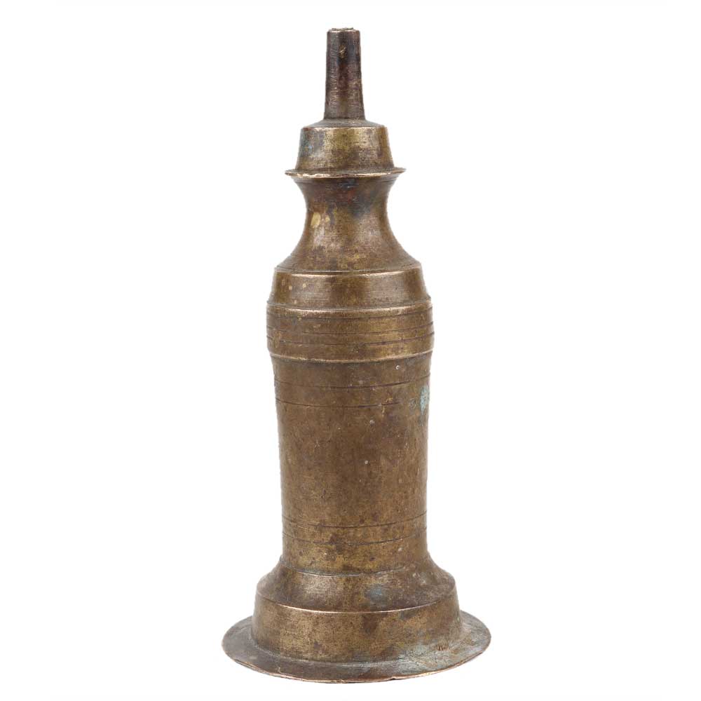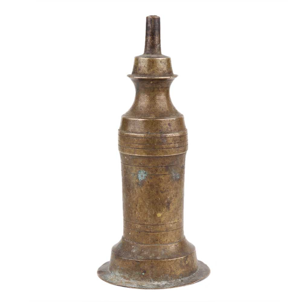 A long antique style brass oil lamp made by a local craftsman in India. The cylindrical container is filled with oil and only one core is open. Decorative showpiece, tables display, wedding gift, stage decoration, home decoration, office desk and gift.