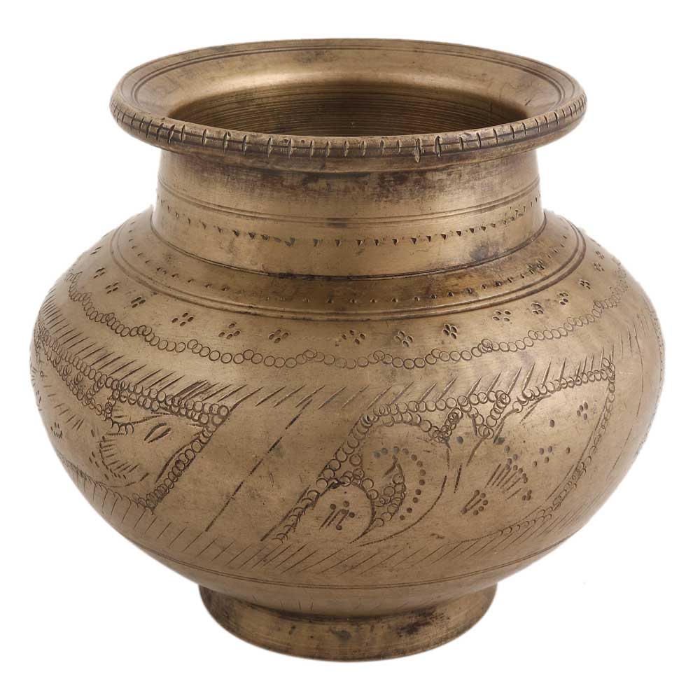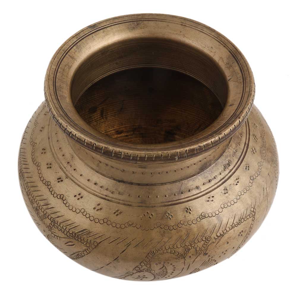 Handmade Patinated Brass Water Pot With Carved Images