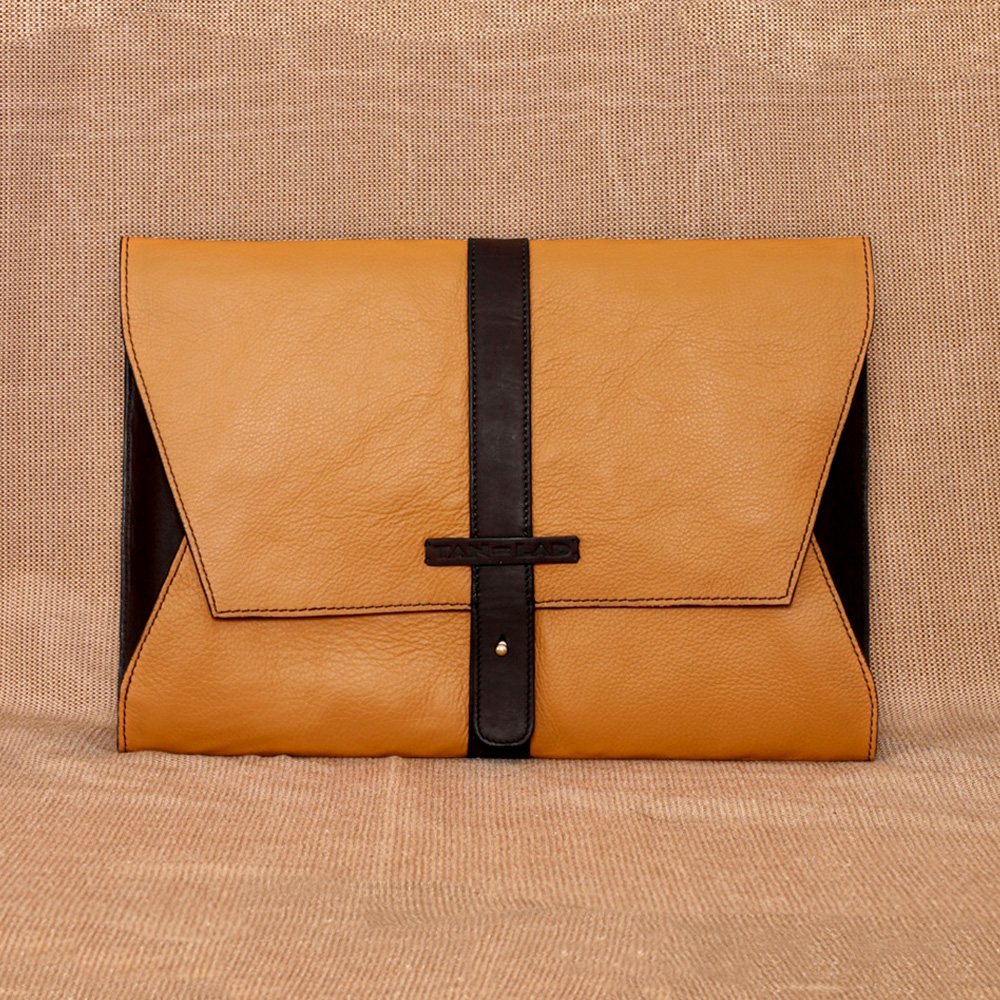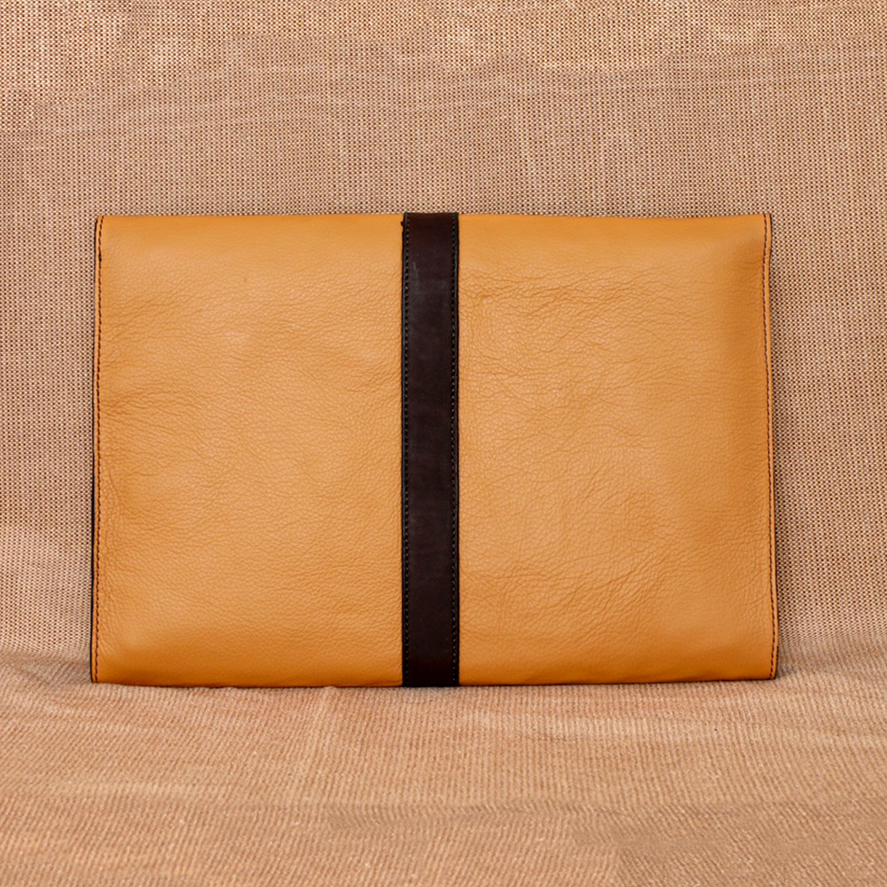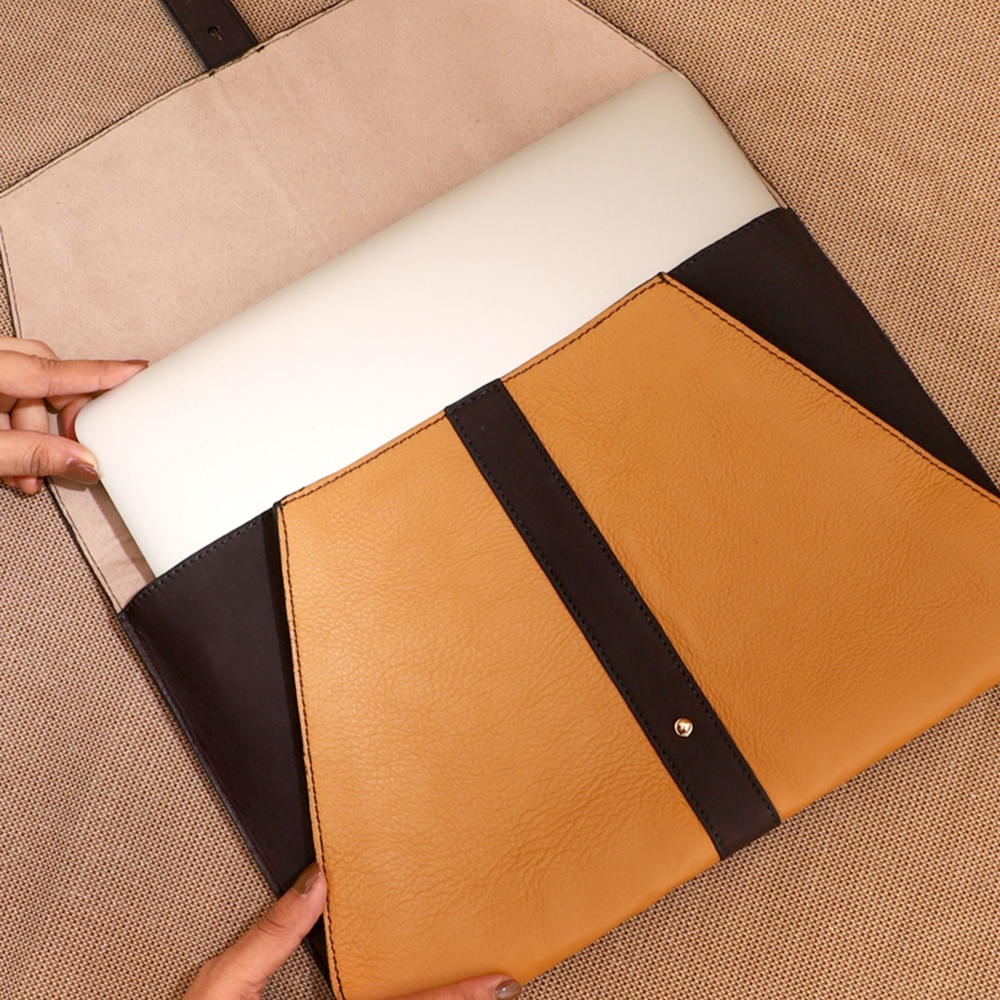 Crafted with gorgeous Peach and Dark Chocolate leather, it features a sleek knob stud flap closure, The Envelope offers easy access to your laptop while keeping it securely stored in the main compartment. Its slim, minimalist design makes it ideal for slipping into a larger bag or carrying on its own, exuding a polished, professional look.
