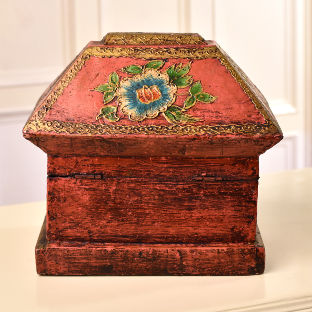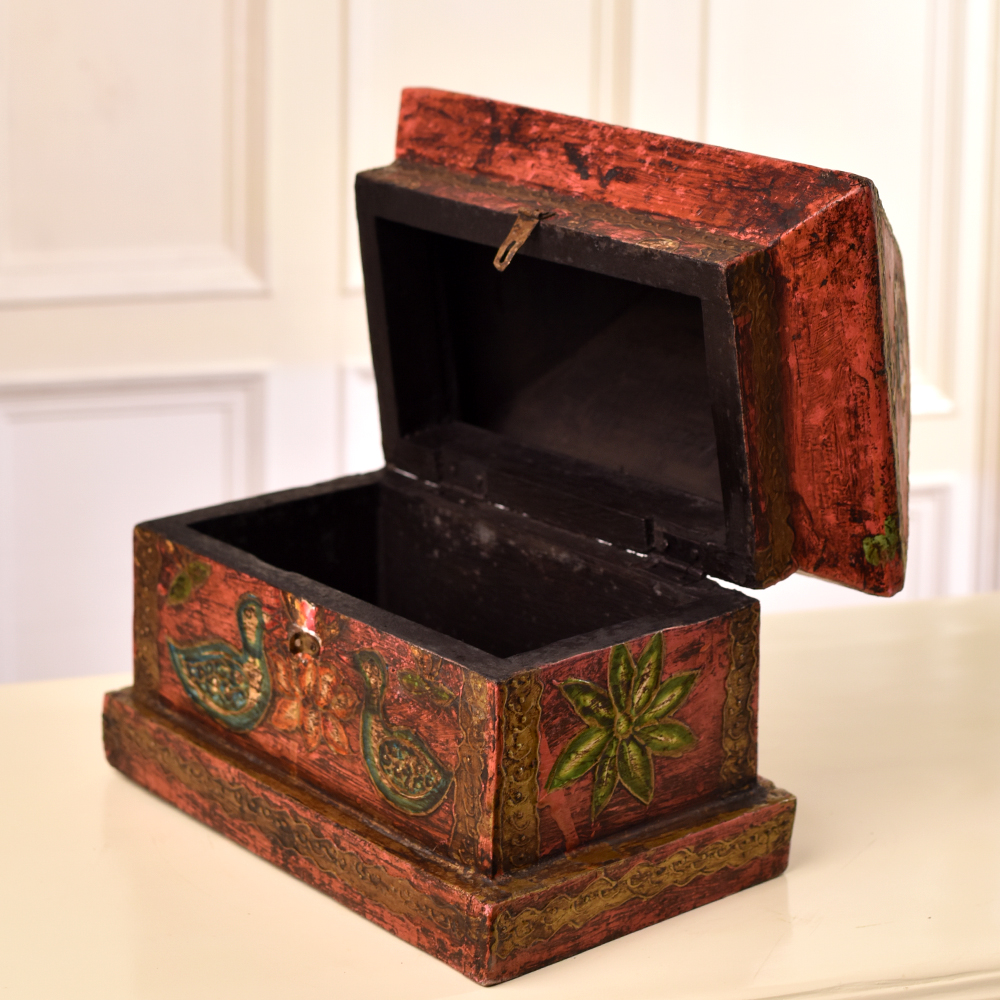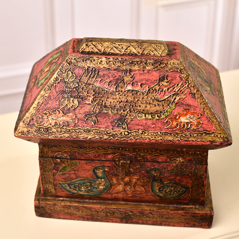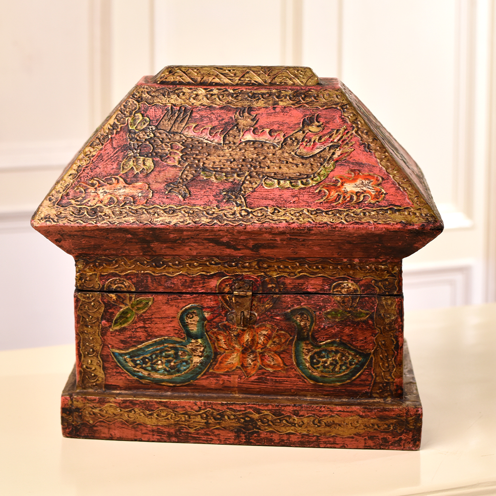 Elegance meets craftsmanship in this exquisite wooden box adorned with captivating dragon and bird engravings. Handmade by skilled Indian artisans, each detail reflects their mastery and dedication. The antique brown finish adds a touch of timeless sophistication, making it a perfect accessory for your cherished jewelry or any small, precious items. With a secure latch, this box ensures both practicality and charm. Its high-quality wood not only guarantees durability but also showcases the rich cultural heritage embedded in every inch. Versatile in its use, it's a functional jewelry box and a stylish storage solution for trinkets. Its beauty isn't confined to your personal space, this box is a conversation starter, fitting seamlessly into exhibitions or displays. Surprise your loved ones with a gift that transcends time - an embodiment of artistry and tradition.