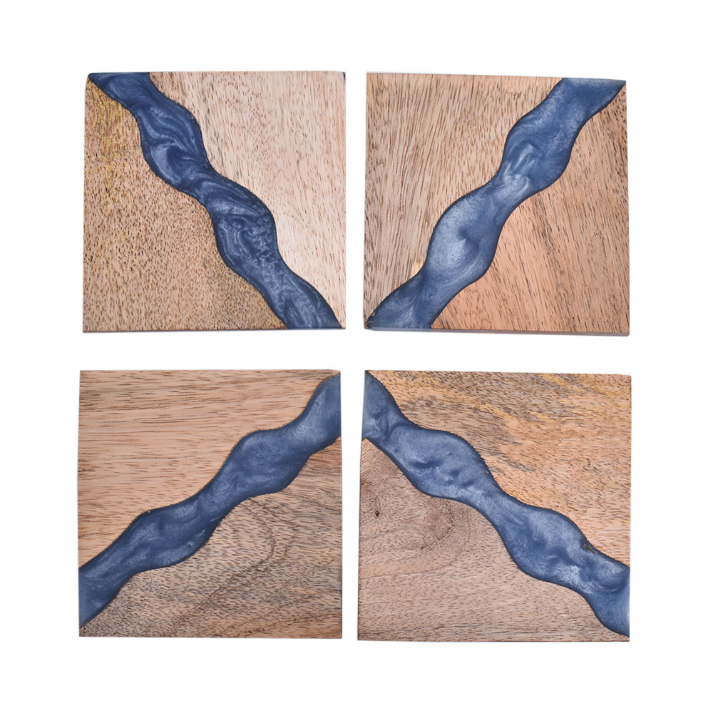 Handmade Prussian Blue Epoxy River and Acacia Wood Set of 4 Decorative Table Coasters with Cover