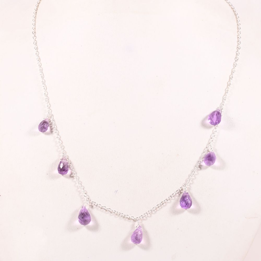 The Handmade Pure 925 Sterling Silver Necklace with Amethyst Drop Pendant for Women is designed to express quiet luxury through colour, form, and artisan sensibility. Featuring a graceful amethyst drop pendant, the necklace brings a soft yet striking focal point to the neckline. The 18-inch length allows the pendant to sit naturally at the collarbone, making it suitable for everyday elegance as well as special occasions. Thoughtfully handcrafted, it balances gemstone beauty with timeless design.