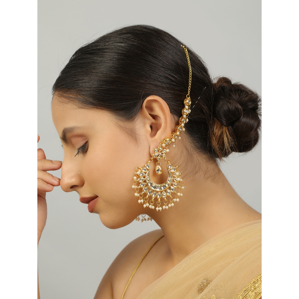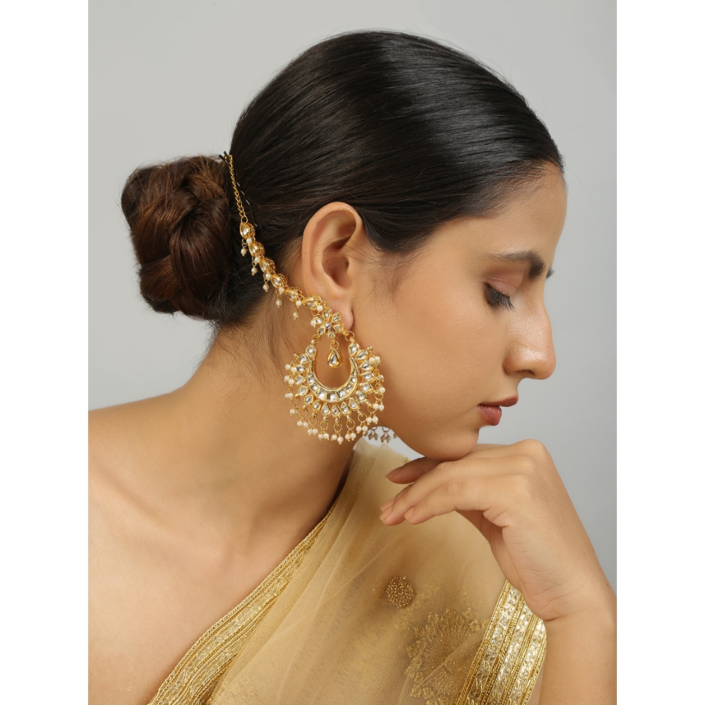 The crescent kundan layout combined with pearl hangings and extended earcuff support creates a unique balance of tradition and statement styling.