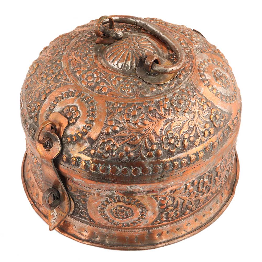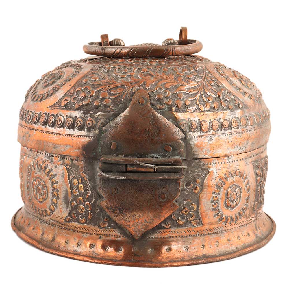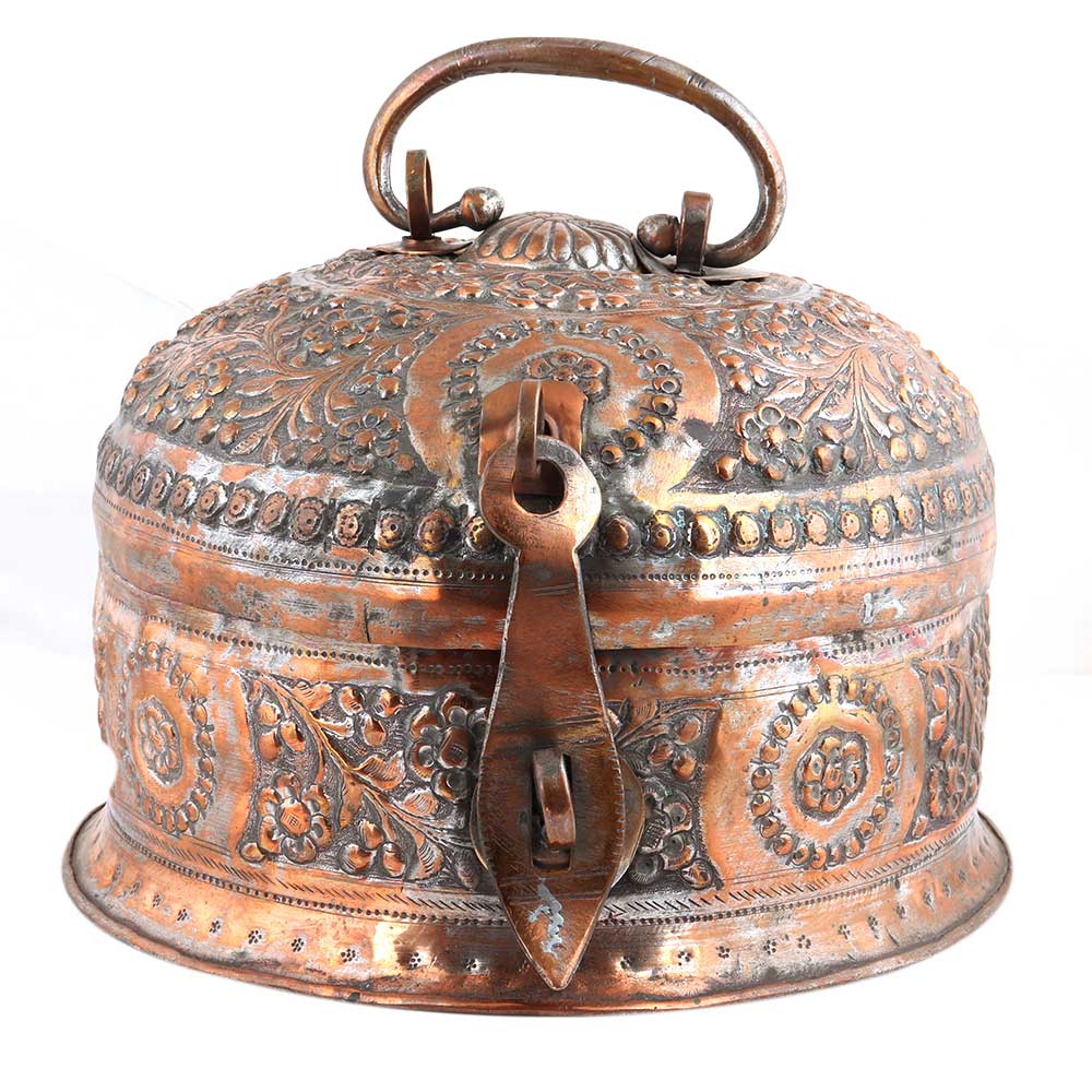 • Handmade Round Brown Copper Storage Box With Embossed Design