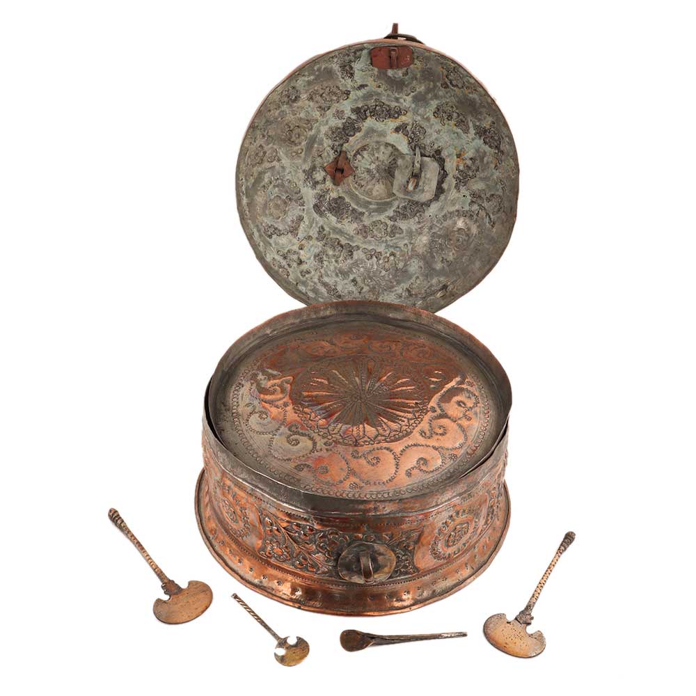 Handmade Round Brown Copper Storage Box With Embossed Design