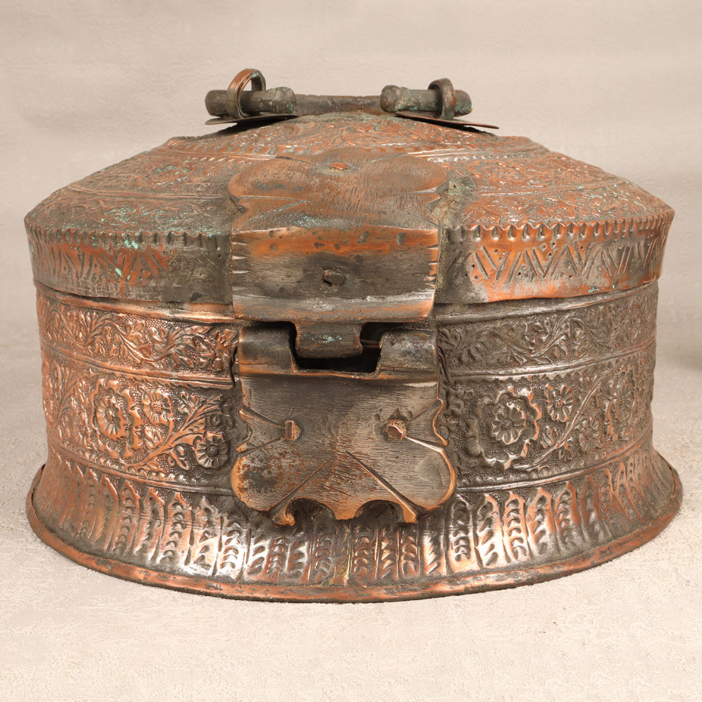 Immerse yourself in the allure of timeless elegance with our exquisite Vintage Round Copper Jewelry Box. Crafted with meticulous artistry by professional Indian artisans in the intricate Islamic Art tradition, this enchanting piece showcases a harmonious blend of history and craftsmanship. The round shape, adorned with captivating engravings, reflects the rich cultural heritage of India. Constructed from high-quality copper, this jewelry box boasts a lustrous antique brown finish, further enhancing its vintage appeal. The secure latch ensures the safety of your precious stones and jewelry, making it not just a decorative accent but a functional storage solution. Versatile and refined, it seamlessly complements any setting, be it at home, in your office, a restaurant, hotel, or cafe. This handmade masterpiece invites you to indulge in the luxurious charm of a bygone era. Perfect for collectors of vintage treasures, it adds a touch of sophistication to any space. Consider it a thoughtful gift for your loved ones on special, festive, or auspicious occasions, letting them bask in the timeless beauty of this unique, artisan-crafted copper jewelry box.