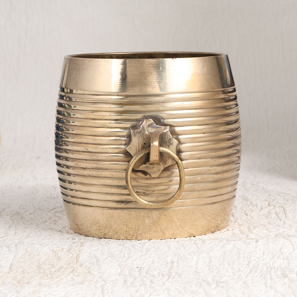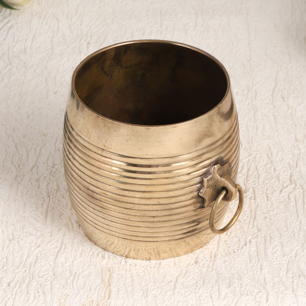 Enhance your home interior with the exquisite craftsmanship of South Indian Art that is embodied in our captivating Drum-Shaped Brass Measurement Pot. Handcrafted by highly skilled Indian artisans, this stunning piece is a testament to their centuries-old expertise and dedication to perfection. Made from high-quality brass, this pot boasts a radiant golden finish that is nothing short of enchanting. Its two elegantly crafted handles add to its charm, making it not just a piece of decor but a work of art. The intricate engravings on the surface tell a story of culture and tradition, making it a conversation starter in any setting. Place it in your home, office, restaurant, hotel, cafe, or shop to infuse a touch of opulence and heritage into the ambiance. This versatile piece also complements vintage collections, adding a timeless allure. With its awe-inspiring aesthetics, it makes for a thoughtful gift on special, festive, or auspicious occasions.