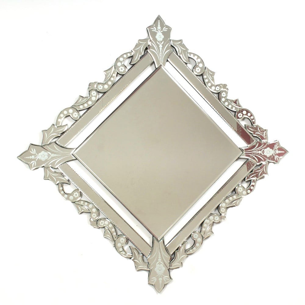 This mirror has a very luxurious appearance with an elegant and detailed frosting design on the edges. The mirror itself is made up of smaller individual mirrors in addition to the central square shaped mirror.