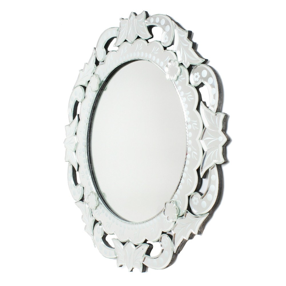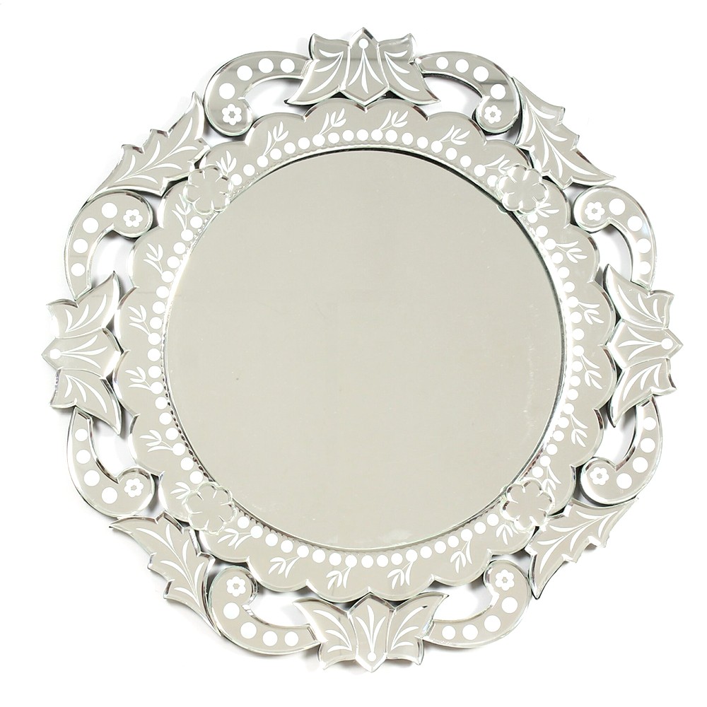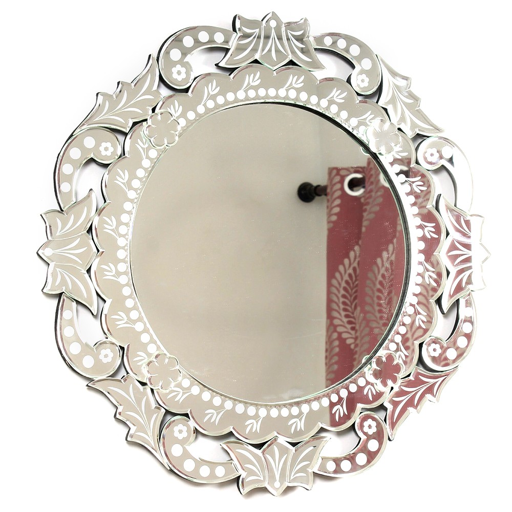 This round mirror uses decorative engraving that is such a popular element in Venetian mirrors, surrounded by heavy scrolls and leaf-shaped frames, making it a magnificent wall mirror, perfect for any space.