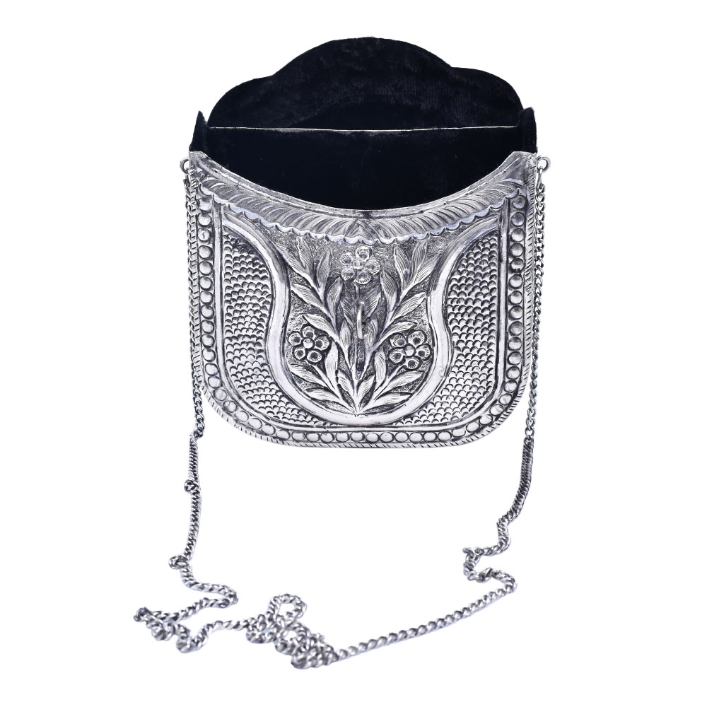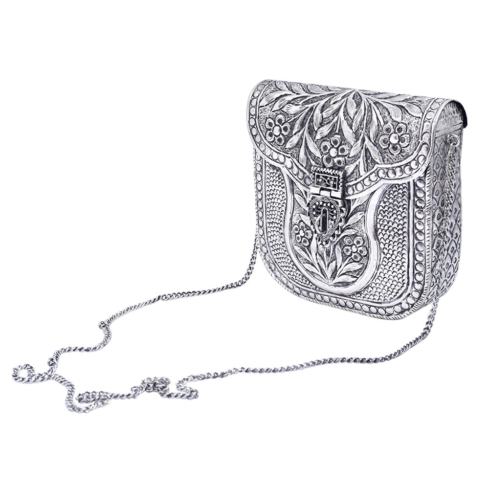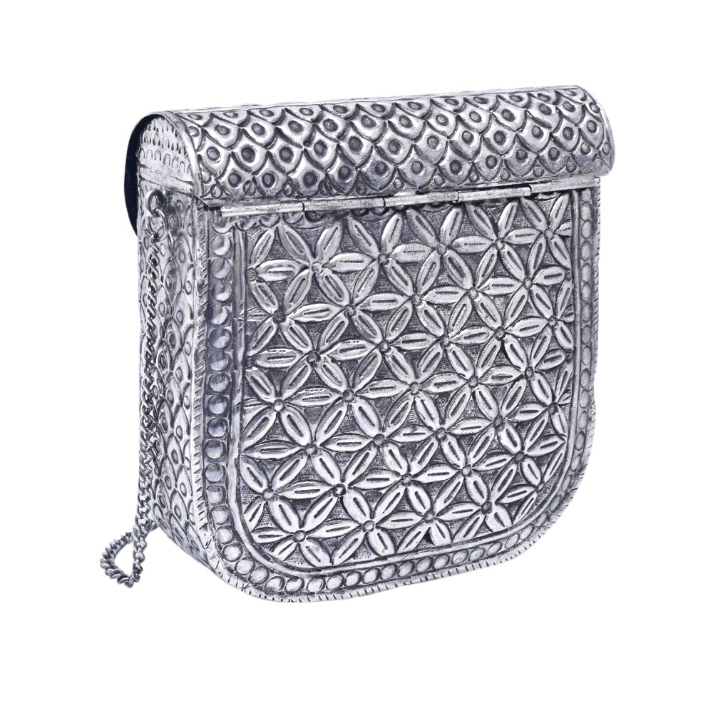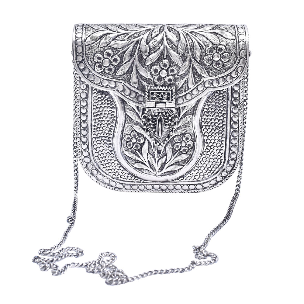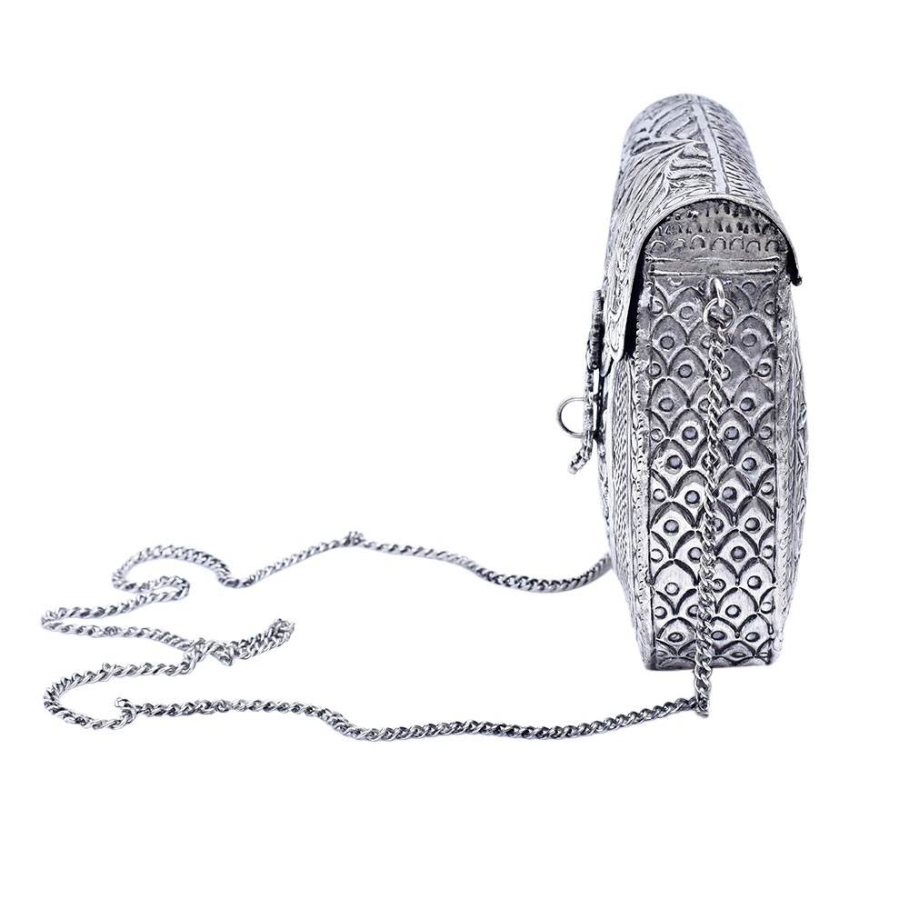 The silver metal alloy handcrafted clutch bag with chain strap is a stunning piece of accessory that combines style and practicality. Handcrafted with a silver metal alloy, it features a unique design that is sure to turn heads. The clutch bag has a compact size that can easily hold essentials like a phone, wallet, and cosmetics, making it perfect for a night out. The chain strap is detachable, allowing it to be carried as a clutch or worn as a shoulder bag. The interior is lined with a soft material for added protection and has enough space to store the essentials. This handcrafted clutch bag is the perfect accessory for formal and informal events, adding a touch of glamour to any outfit.
