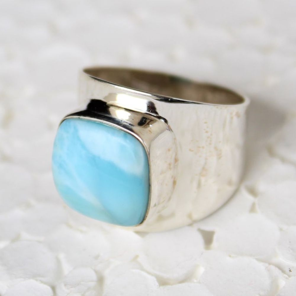 Add a serene and stylish touch to your jewelry collection with this handmade Larimar gemstone ring, crafted from brass with silver plating. Featuring a natural Larimar gemstone, known for its calming energy and oceanic blue hues, this ring is perfect for both men and women who love handmade, unique, and meaningful jewelry. Available in size 6.5 US, it makes a versatile and elegant statement on any finger.