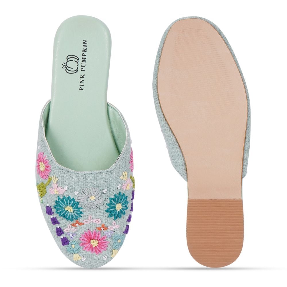Gently clean floral mules with a soft brush; store in a cool dry place and avoid prolonged sun exposure.