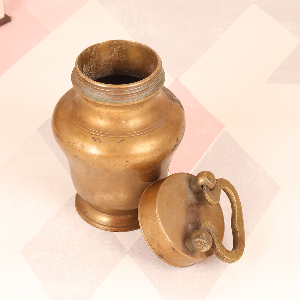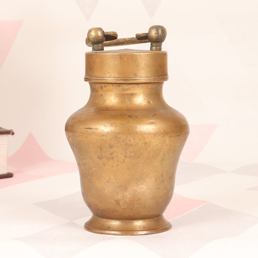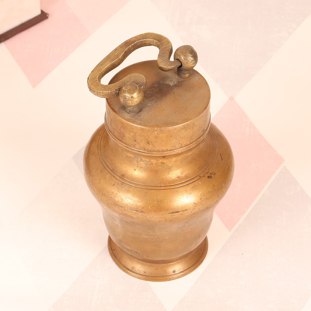 This exquisite vintage brass holy water pot is a breathtaking piece of South Indian art that will elevate your spiritual practice and home decor. Meticulously handcrafted using time-honored techniques, its elegant brass construction and plain brown finish exude a sense of timeless sophistication. The lidded design allows you to easily store and dispense holy water, while the convenient handle makes it a breeze to carry from room to room. Whether you use it to bless your home, cleanse your body, or simply admire its beauty, this holy water pot will infuse your space with a profound sense of sacredness and tranquility. Suitable for practitioners of Hindu, Buddhist, or other spiritual traditions, this stunning vessel is a must-have for anyone seeking to deepen their connection to the divine. Infuse your daily rituals with reverence and grace, and let this vintage brass masterpiece become a cherished centerpiece in your sacred sanctuary.