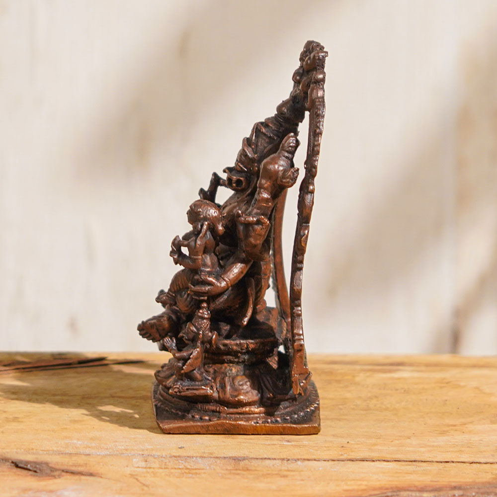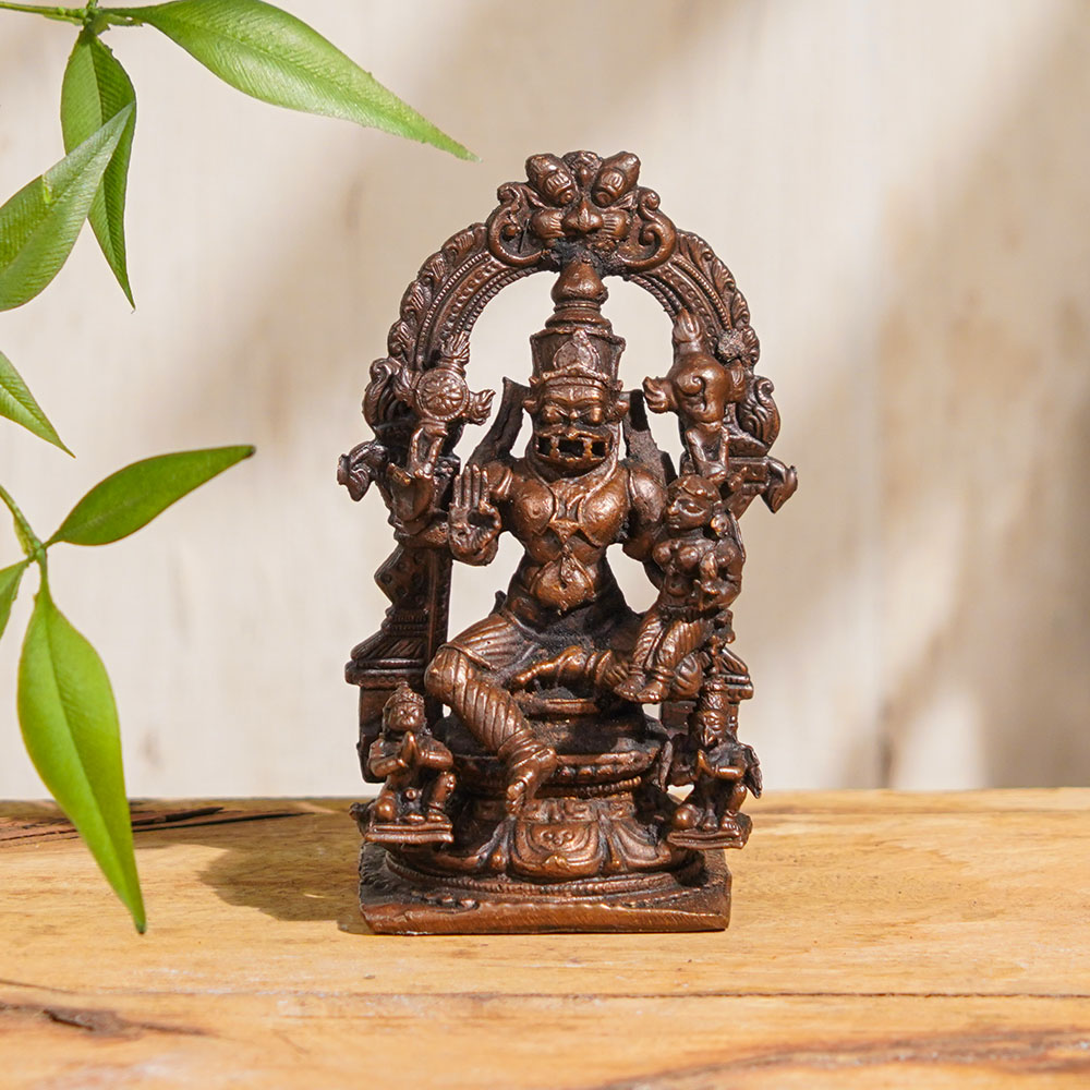 Experience the blissful union of Lord Narasimha and Goddess Lakshmi with this exquisite copper statue, lovingly handcrafted by skilled Indian artisans. Lord Narasimha, the fierce incarnation of Lord Vishnu, is depicted in a majestic seated posture with the radiant and graceful Goddess Lakshmi sitting on his lap, symbolizing their divine partnership. This Lord Narasimha and Goddess Lakshmi copper statue is a true masterpiece, with intricate details and fine craftsmanship that showcase the artistry and devotion of Indian artisans. It is perfect for worshipping in your home temple, creating a sacred ambiance of divine blessings, protection, and abundance. Not just for worship, this exquisite Hindu idol also serves as a remarkable piece of art for home decoration or collection. Its radiant aura and spiritual significance make it a meaningful gift for your family, friends, or relatives on special occasions, conveying your heartfelt blessings and good wishes. Bring home the divine blessings of Lord Narasimha and Goddess Lakshmi with this beautifully crafted copper statue, elevating your spiritual practice and adding a touch of divine grace to your home.