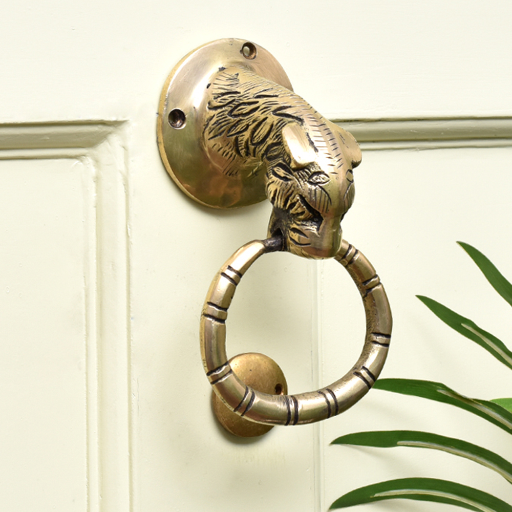 Indianshelf.com for bulk/wholesale orders.Indianshelf.us for personal purchases.Make a striking impression with the Handmade Tiger Head Brass Ring Door Knocker. This beautifully crafted door knocker showcases a stunning tiger head sculpture, meticulously created by skilled artisans using high-quality brass. Its majestic and fierce look radiates strength and sophistication, making it a perfect addition to any front door, offering both functionality and a bold design element for your home.