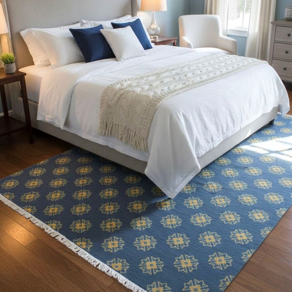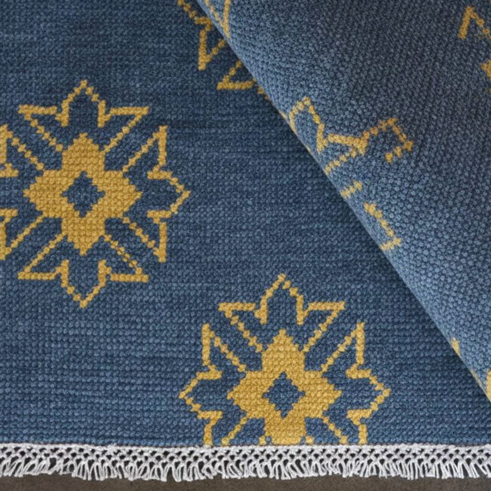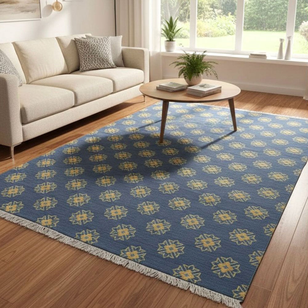 Vacuum gently and rotate the rug periodically to distribute wear evenly. Avoid direct sunlight and moisture, and have the rug professionally cleaned every two years to remove dirt and maintain its appearance.